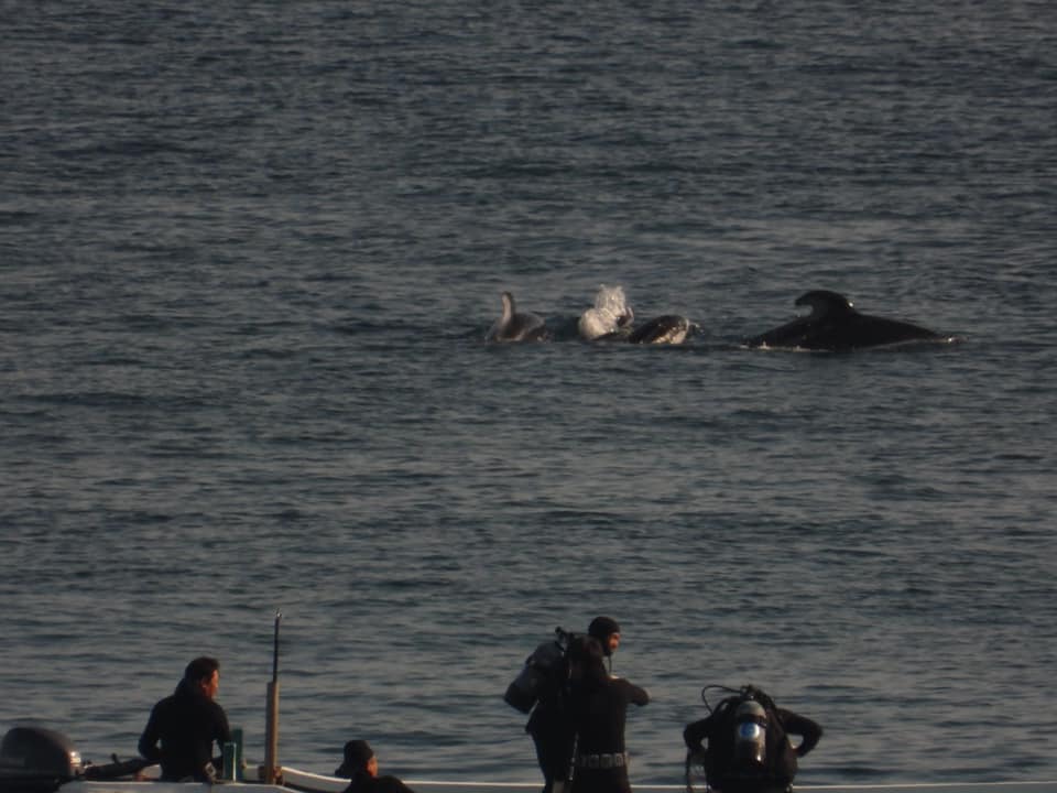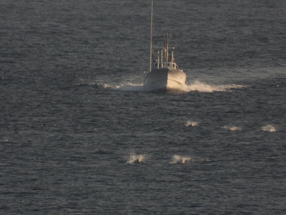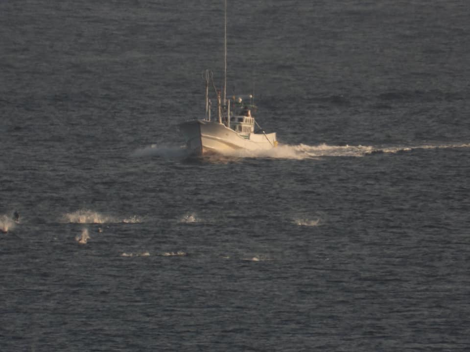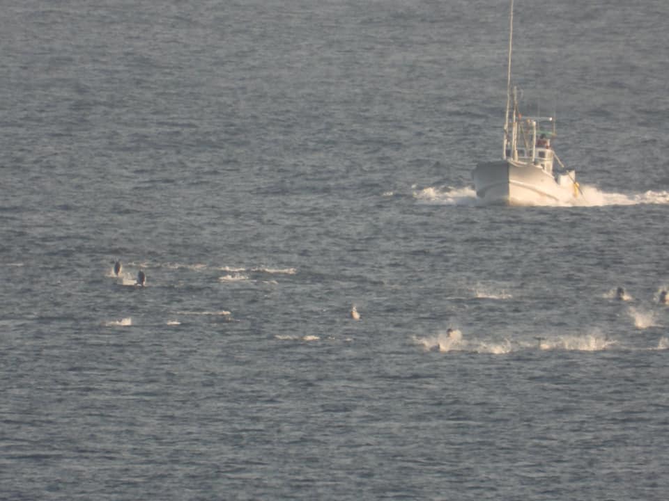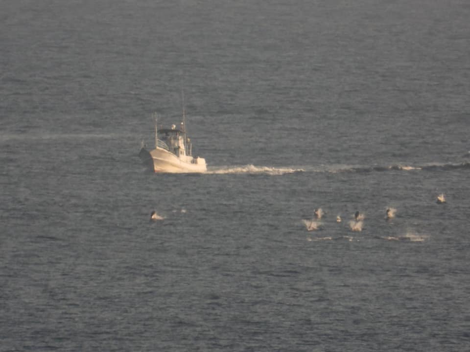 Heute Morgen kurz nach dem die Verbrecher von Taiji den Hafen verliessen um Delfinfamilien zu zerstören, eine Stunde darauf terrorisierten sie eine sehr grosse Gruppe pazifische Weisseiten Delfine in Richtung Bucht.
