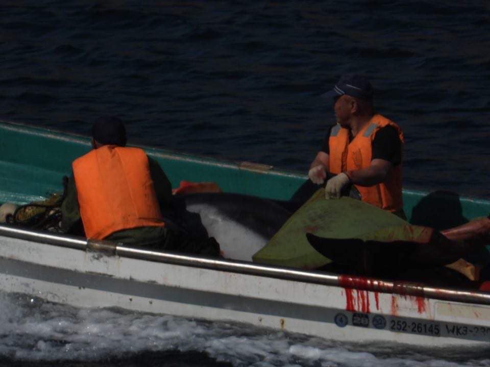 Die Jagschiffe sind heute 22. Februar nicht hinausgefahren um Delfine zu terrorisieren, ein anderes Nach-Verbrechen zu gestern fand heute statt. Viele Menschen wunderten sich wieso die Killer mit einem Schwimmkäfig voller wertvoller Weisseiten Delfine zur See hinausfahren die gestern brutal und mit grösster Gewalt entführt wurden. Die Antwort habe ich sofort gewusst, sie entsorgten schwerverletzte Delfine auf See, die so schwer verletzt sind, dass ihre Chance zu überleben gering ist.