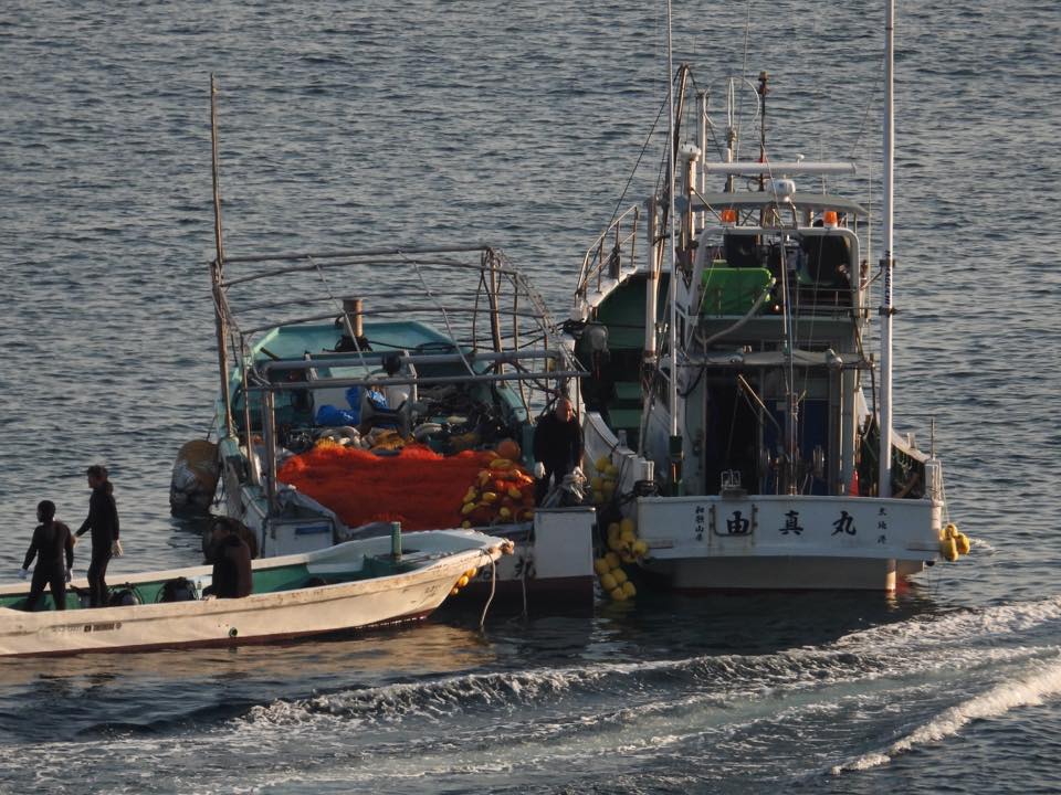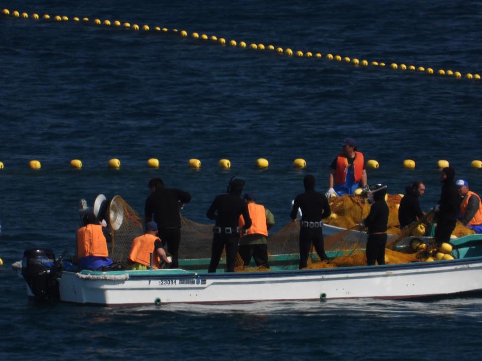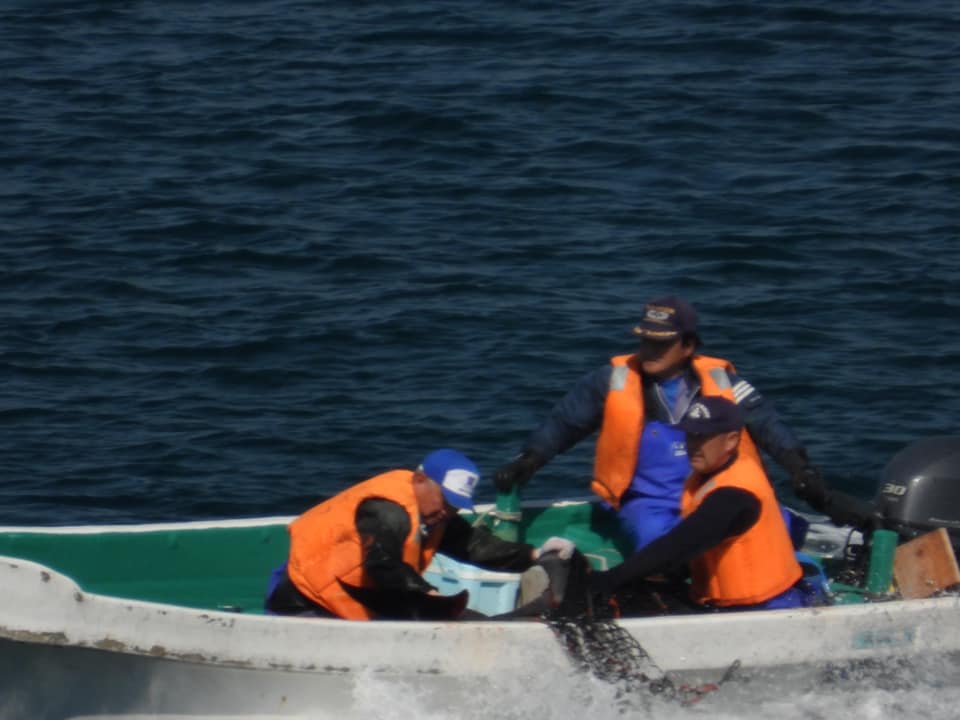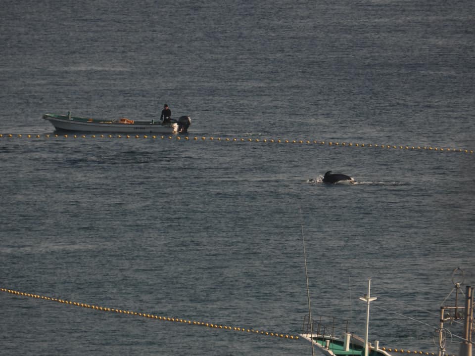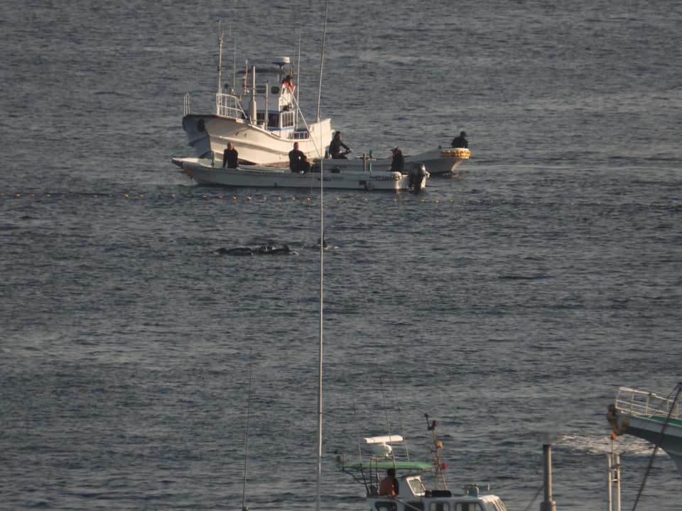 Gestern, und heute sind noch mehr japanische Aktivisten in Taiji vor Ort, schreien heftig und andauernd durch Grammophone, übersetzt «Lass die Delfine gehen, lass sie in Ruhe». Einige Jagdschiffen waren schon in den Hafen gefahren, brach plötzlich bei den noch verbleibenden 8 und 6 Booten mit Tauchern und Entführern Hektik auf. Es sah zuerst so aus, als wären die Delfine geflüchtet. Das grosse Schiff, an das der Zwergwal Hope an der Schwanzflosse gefesselt und ertränkt wurde, hat das Netze heute vor den Delfine ausgelegt. Was wiederum bestätigt, dass die Fischer und Delfinjäger ein und derselbe Abschaum sind, nämlich Mitglieder der japanische Delfinmafia der Fishery Union ISANA.