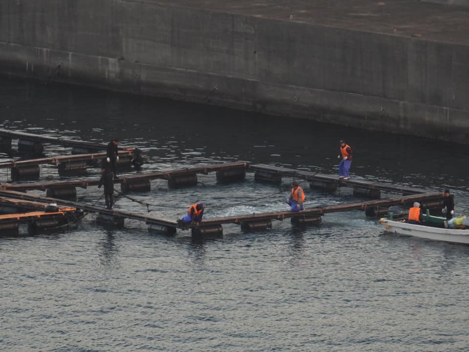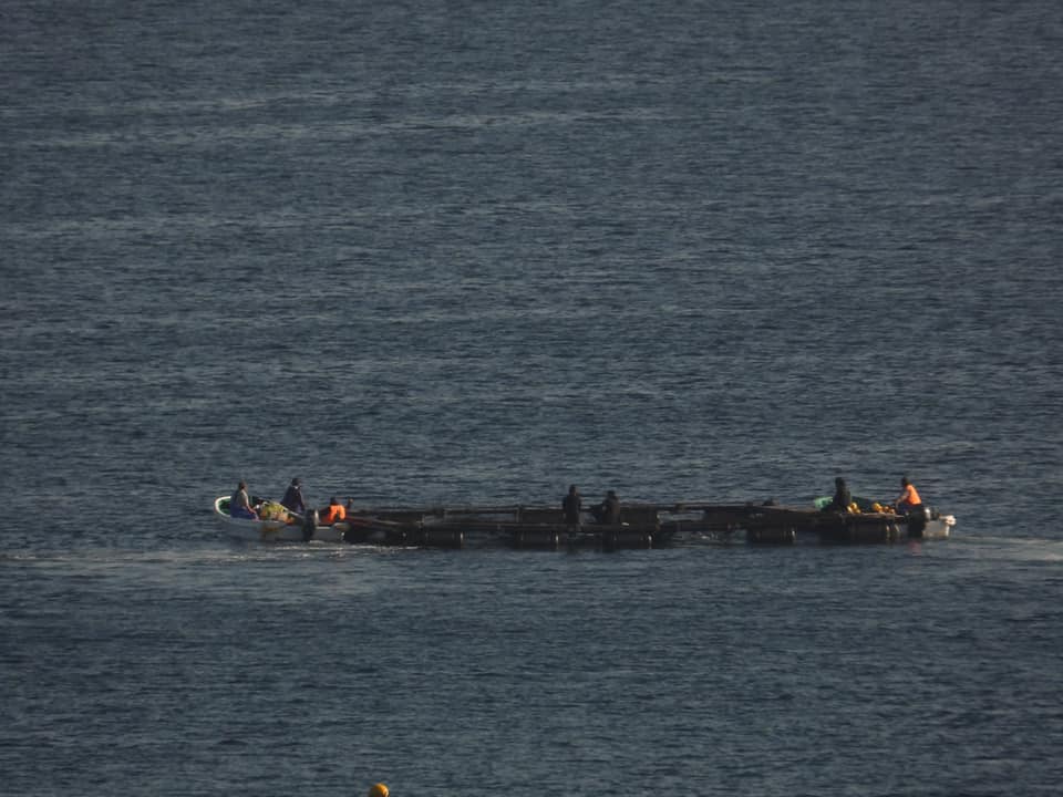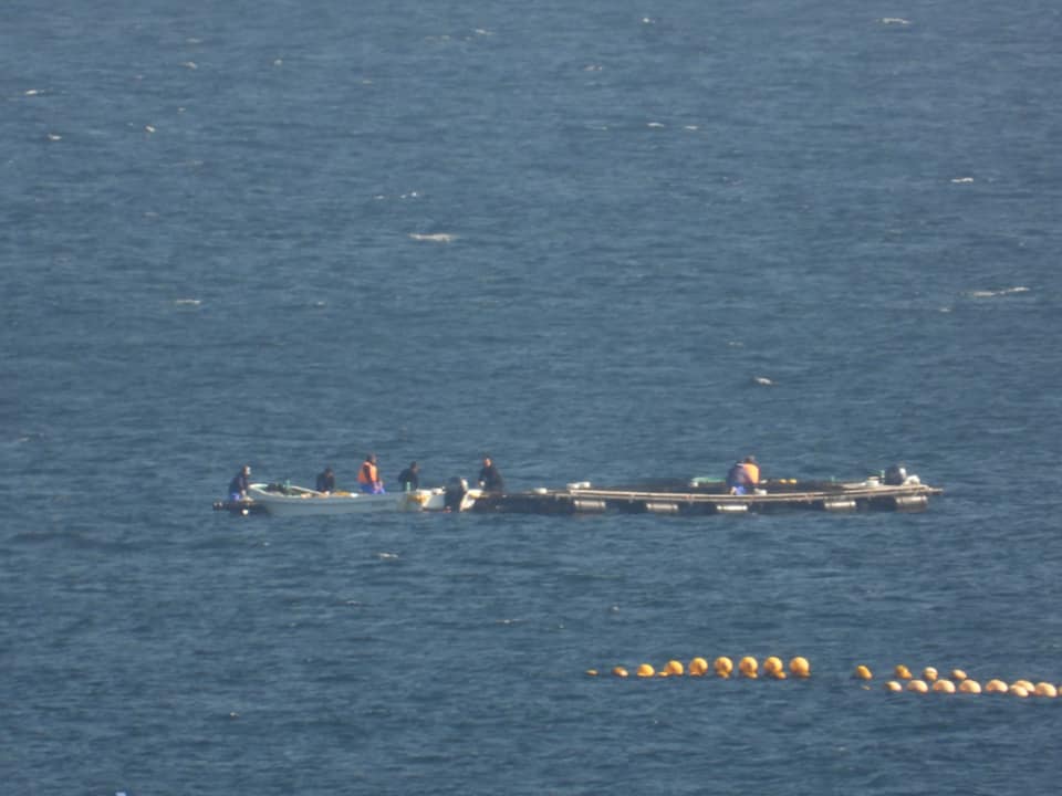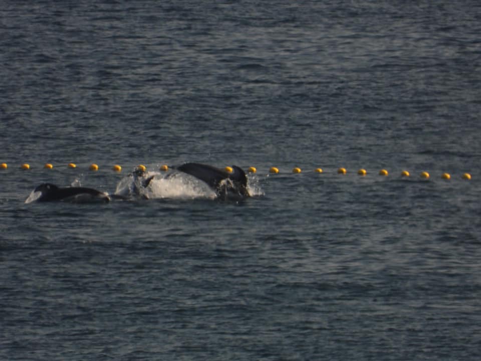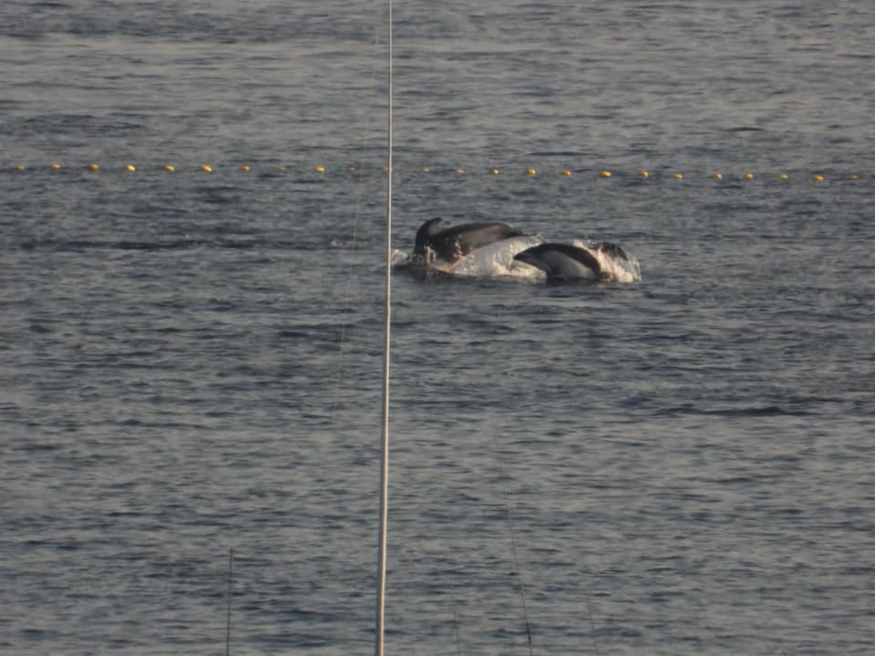 Vermutlich warfen sie verletzte und grosse Delfine in diesen Käfig um bei einer zweiten Selektion ein paar heraus zu nehem. Es ist aber durchaus denkbar, dass auf dem Boden des Netzes tote Delfine liegen, die die Gewalt nicht überlebt haben und an den Fogen der Verletzungen starben. Wir vermuten die Killer entsorgen verletzte, tote und zu grosse/alte Delfine aus diesem Käfig im Meer. Kunito hatte sie gefilmt wie dieser Abschaum weit draussen die Netze öffneten und danach mit grösserer Geschwindigkeit den Käfig wieder zu den anderen im Hafen brachten. *Bilder in der Bildergalerie zugefügt