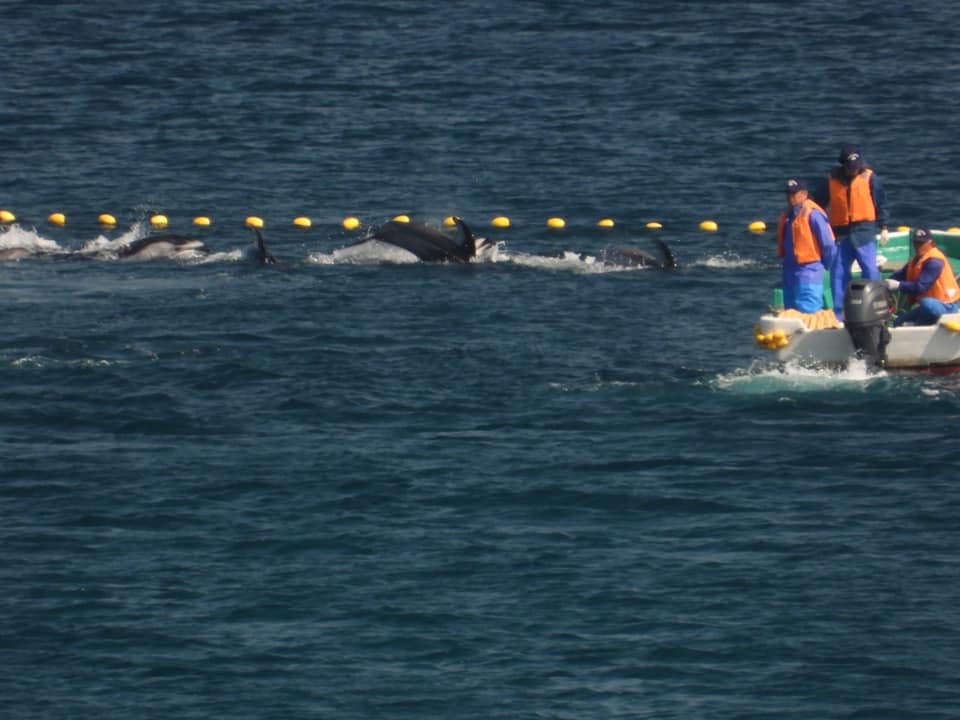 Zuerst haben die Monster mit einem Netz den Delfinen die Flucht in den Ozean versperrt, durch umherrasen machten sie ihnen noch mehr Angst, damit sie untertauchen und an Ort verbleiben, um sie mit dem Netz weiter einzukreisen zu können. Mit zwei Jagdschiffen ziehen sie das Netz näher ans Ufer heran, vor dem Netz rasen Jagdschiffe und Boote hin und her, verpesten mit ihren Rauchschleudern die Umwelt und machen den verängstigten Meeressäugern noch mehr Angst.