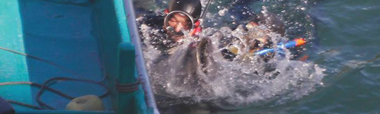 Bild: Ein Delfinkind wird nach dem groben Wrestling mit mehreren Tauchern an ein Boot in ein schwarzes Netz geschoben und unter die Planen ans Ufer gezogen