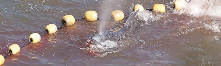 Nach dem die Delfine in die Bucht getrieben wurden, terrorisierten die Killer mit ihren Booten einer nach dem anderen unter die Planen in den Tod. Einige verfingen sich in den Netzen, Taucher rissen sie heraus, schoben sie zu einem Boot in ein Netz, der sie unter die Planen zu den Wirbelsäulen-Zerstecher in den grausame Tod schleppte.
