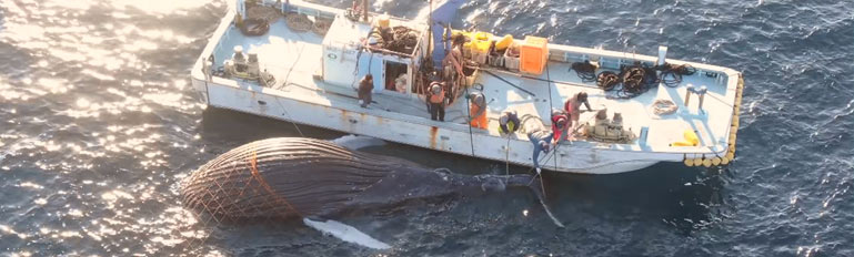Bild: Fischer der Delfinmafia bemühen sich den toten Buckelwal aus dem Netz zu zerren