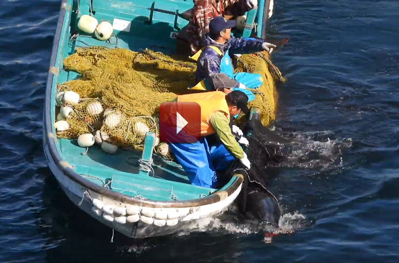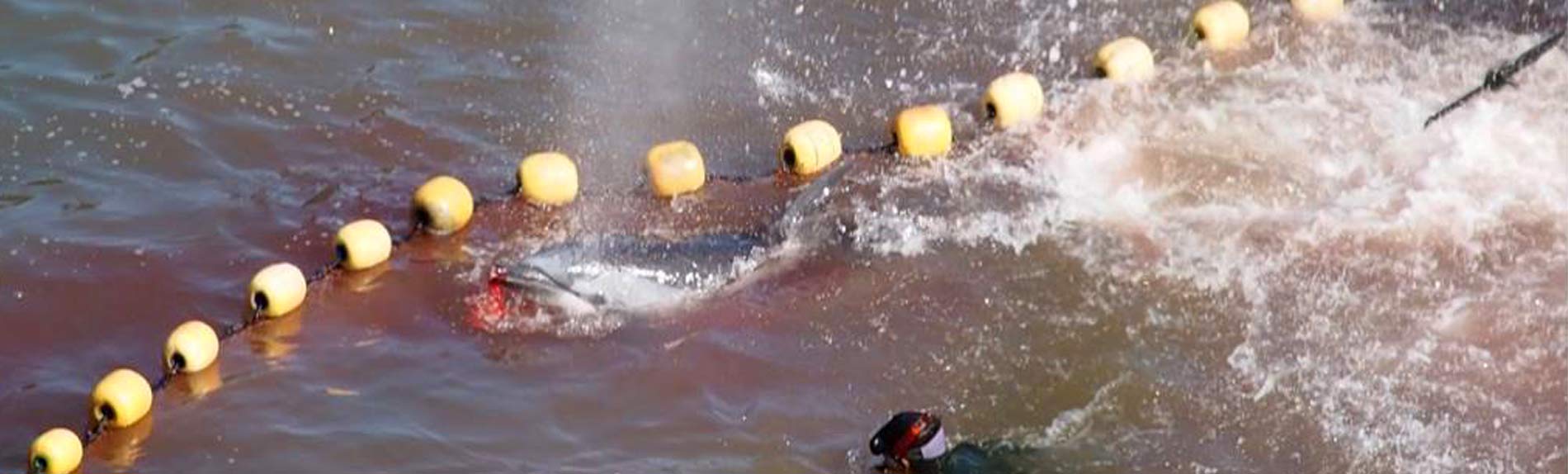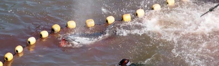 Bild: In grösster Angst und panischer Flucht, weg wollend vor dem Terror der Motorboote, verheddern sich Delfine an der linken Seite der Bucht in den Netzen
