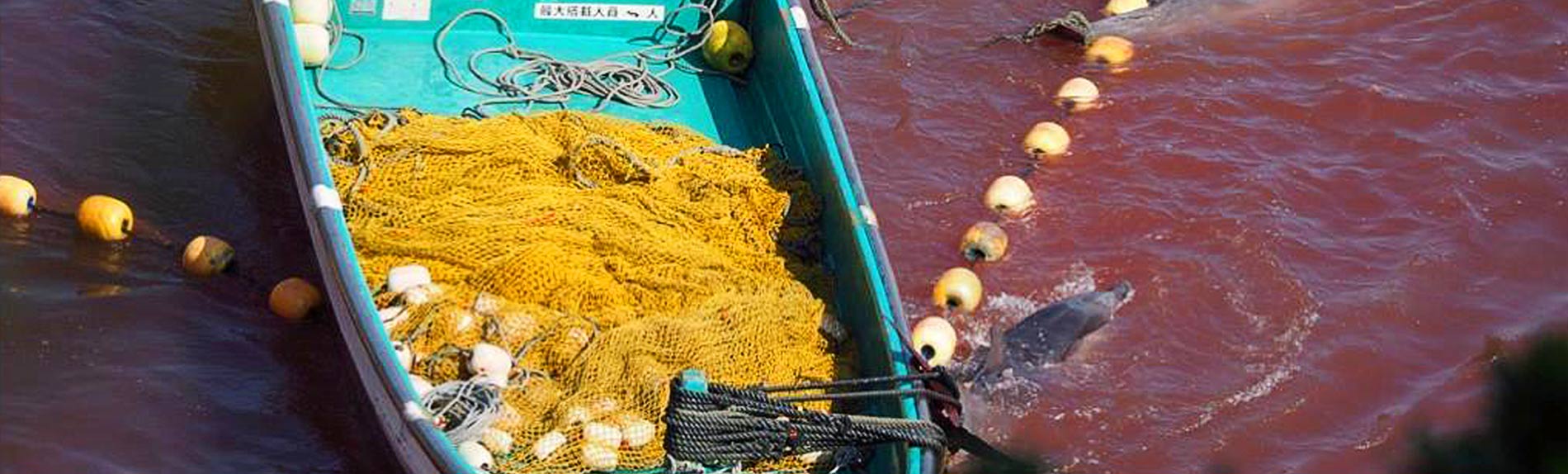 Auch diese Delfine wurden mit den Booten in der Bucht äusserst brutal misshandelt und terrorisiert. Und wie gestern, ins innerste Netz vor dem Mörderstrand, warfen sich in Panik geratene Delfine an die scharfen Felswand oder schwammen ins Netz. Ein paar total verängstigte Delfine, etwa vier, kauerten sich zusammen und blieben an der Felswand regungslos stehen/liegen. Taucher schwammen zu den Meeressäugern und rissen sie mit Gewalt auseinander und an den Flossen haltend unter die Planen in den Tod.