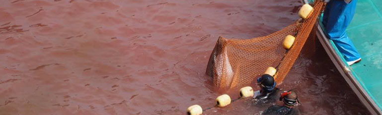 Bild: Streifendelfin Babys und Kinder fliehen aus Angst und Panik vor den brutalen Monstern ins Netz, verheddern sich und verletzen sich teils schwer durch die scharfen Netzwaben.