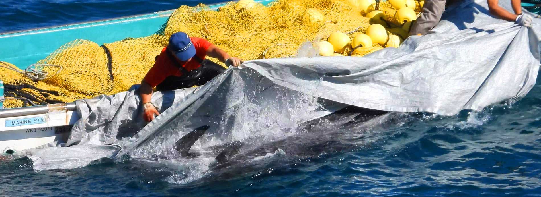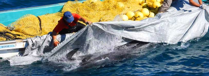 Bild: Ein Delfin versuchte durch das Netz zu flüchten und blieb daring hängen. Taucher rissen ihn aus dem Netz und schleppten das verängstigte wehrlosen Säugetier mit einem Boot unter die Planen an den Mörderstrand in den Tod.