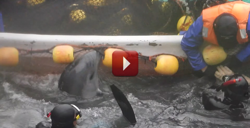 Bild: Vier entführte Delfinkinder, von ihren Mütter entrissen, werden zu einem Schwimmgefängnis im Hafen transportiert und hineingeworfen