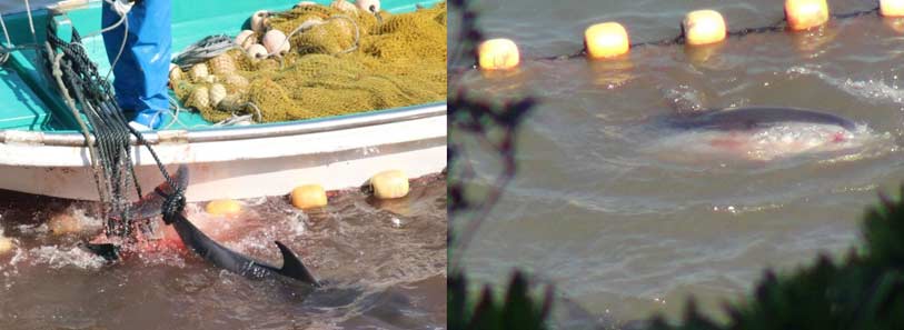 Bild: Blutig verletzter Streifendelfin im Netz vor dem Strand, verwundet durch die brutale Gewaltanwendung des Abschaums von Taiji