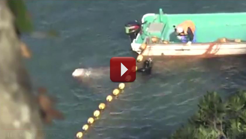 In Panik flüchteten ein paar Rissos Delfine in die Netze und verhedderten sich darin. Die Killer zogen sie mit Seilen an der Schwanzflosse befestigt mit ihren Motorboten aus dem Netz und schleppten die panisch verängstigten Meeressäuger direkt unter die Abschlachtplanen. Innerhalb nur einer Stunde war das Massaker vorbei.