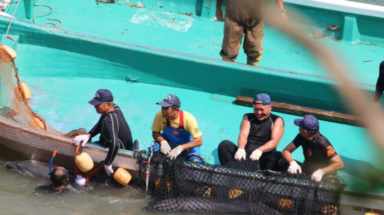 Taiji-Japan - 38 Tümmler wurden heute von ihrer Familie gestohlen. Trainer und Killer überführten die Gefangenen mit Booten in die Schwimmnetze im Hafen von Taiji. Der Rest der verwirrten und erschöpften Delfin Familie sowie 25 Pilotwale werden eine zweite Nacht in der Mörderbucht in Netzen gefangen gehalten, ihr Schicksal für morgen ist unbestimmt.