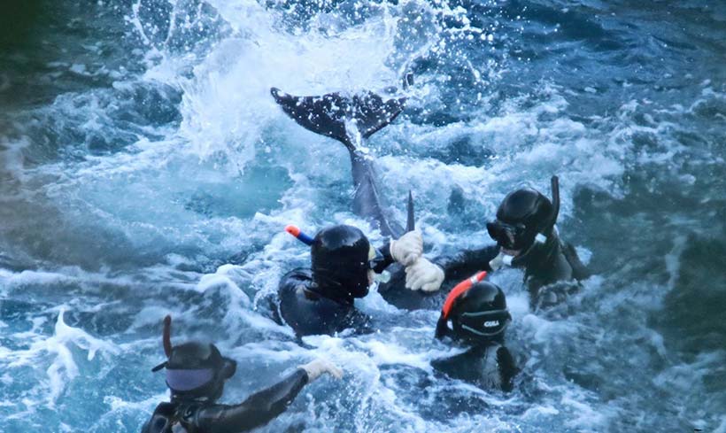 Endlich, nach fünf Tagen Schrecken und Misshandlung, am Nachmittag um 13:54 Uhr Lokalzeit-Japan war der Terror für 200 + Delfine vorbei...