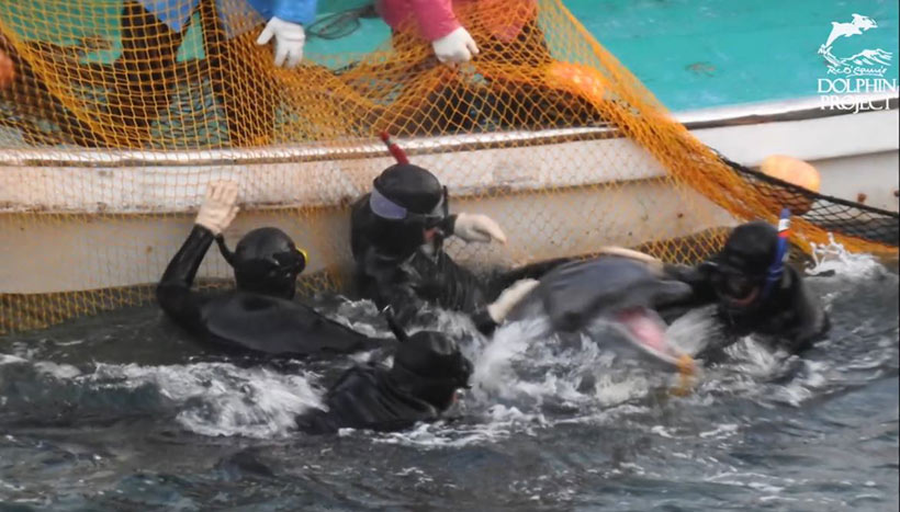 Heute früh am Morgen startete die von der japanischen Regierung unterstützte Mafia aus Taiji für ihren lukrativen Handel mit Delfinen das grausamen Auswahlverfahren der gestern in die Bucht getriebenen Delfinfamilie. Ein sehr langer Terror-Tag war zu erwarten …