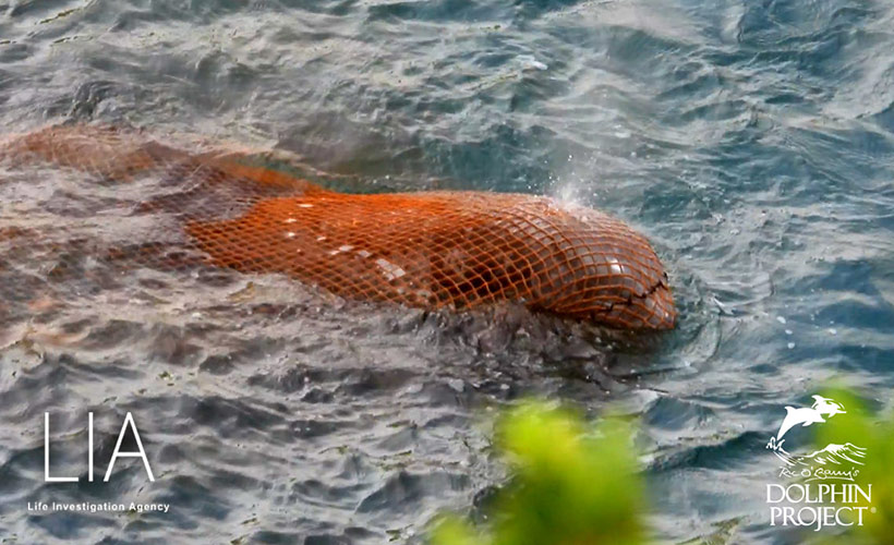Plötzlich entdeckte Ren einen Wal mit dem Kopf unterwasser, der an das Fischerschiff gefesselt ist. Der Fischer-Abschaum von Taiji ertränkt auf diese schreckliche Weise des öfteren Wale. Wir hatten denselben Fall des Zwergwals HOPE dokumentiert, der genau vor einem Jahr durch die gleichen Fischer grausam ertränkt wurde.