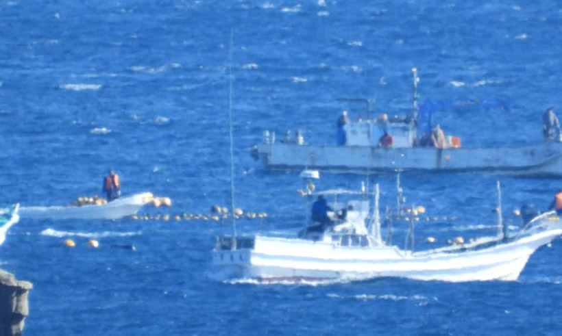 Der schreckliche Tag von gestern hat sich heute wiederholt, wieder begannen die ersten Jagdschiffe nach zwei Stunden vergebener Suche nach Delfinen in den Hafen zurückzukehren. Plötzlich, etwa 500 Meter vom Hafen entfernt, drehten sie abrupt um und rasten mit hoher Geschwindigkeit...