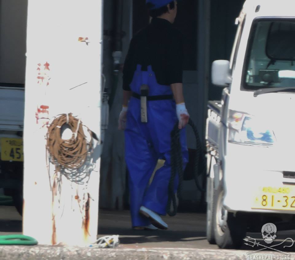 Alle Mitglieder der Rundkopfdelfin Familie sind jetzt unter den Planen. Das brutale Abschlachten hat nun begonnen. Einem nach dem anderen durchstachen die Mörder die Wirbelsäulen mit Eisenstangen. Dem letzten Delphin wird nun die Eisenstange in die Wirbelsäule gehämmert, während die anderen qualvoll sterbend vor sich hin verbluten.