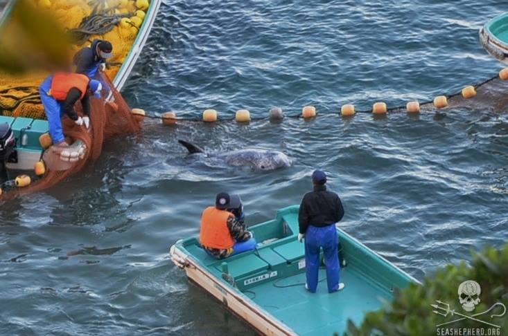 Aggressiv und mit unglaublicher Brutalität schlugen und prügelten die Mörder die kämpfenden Delfine während einer nach dem anderen an Seilen angebunden aus den Fischernetzen unter die Tötungsplanen am Ufer gezogen wurden.