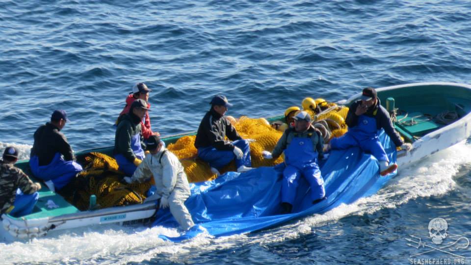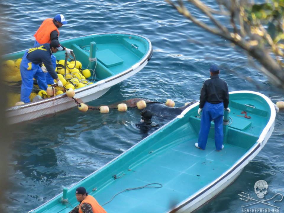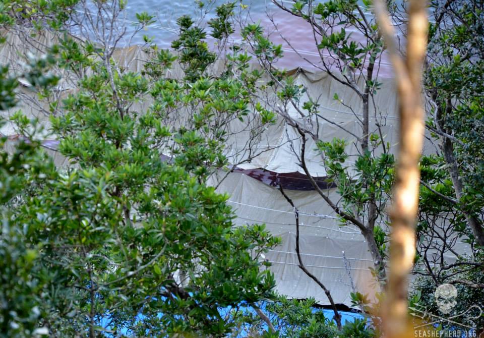 Die Delfinleichen unter Planen verborgen werden nun aus der Blut gefüllten Bucht an Seilen mit Booten zum Schlachthaus geschleppt wo sie zu Sushi für die Belvolkerung von Japan verarbeitet werden.