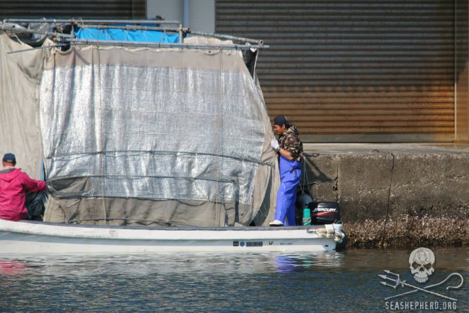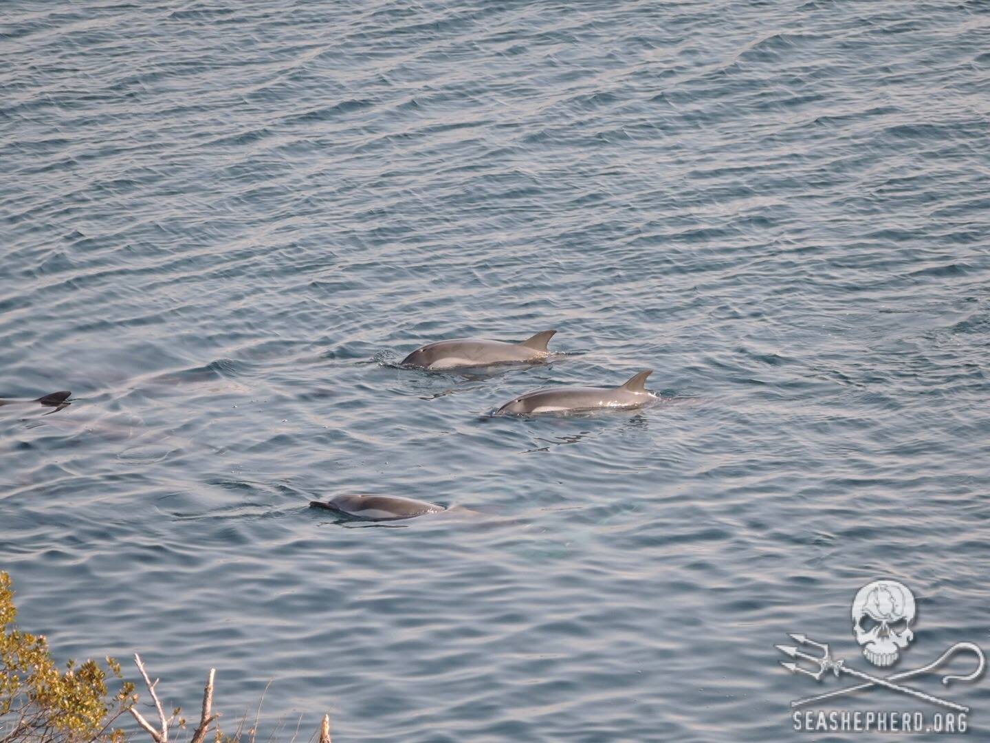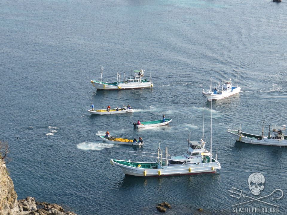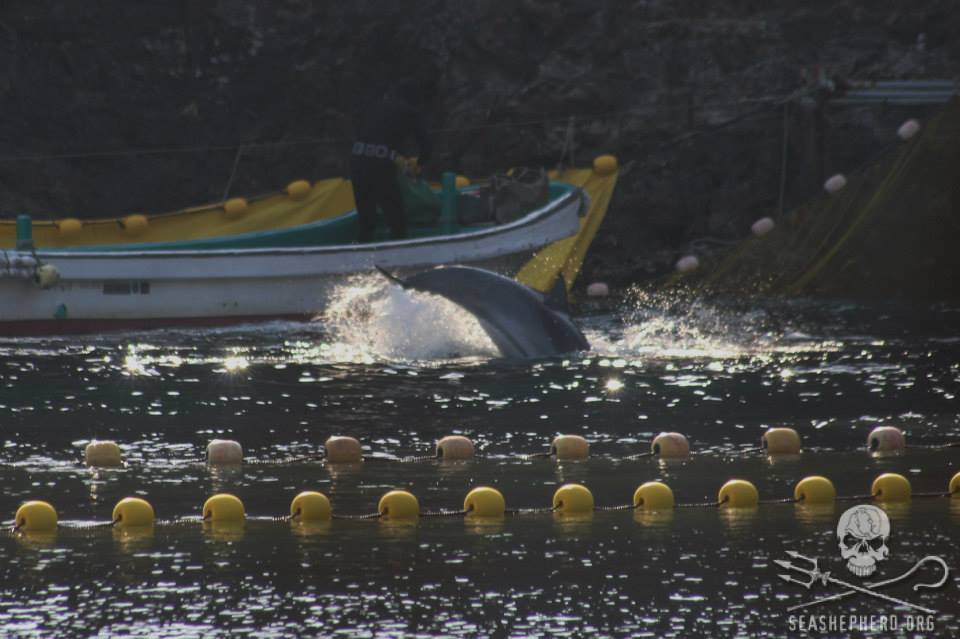 In der Nähe des Hafens versuchten die Mörder die Delfinfamilie in zwei Gruppen aufzuteilen, die Hälfte der Delfine konnte glücklicherweise die Flucht in tiefere Gewässer ergreifen und ihre Freiheit erlangen. Morgens um ca. 09.15 Uhr war der Rest der verängstigten Familienmitglieder durch die Schikanen der Schiffe und Boote in der Mörderbucht in Netzen gefangen, wo ihnen der qualvolle und grauenvolle Tod bevor steht.