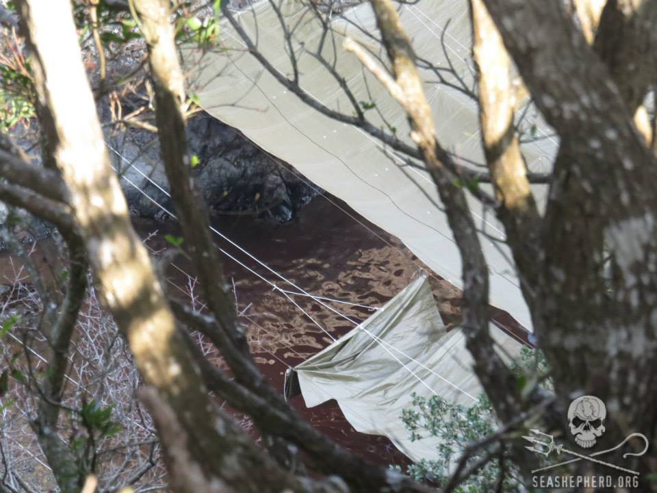 Die Mörder zogen am Schwanz mit Seilen angebunden einen Delfin nach dem anderen unter die Planen an der Küste und begangen mit dem blutigen Massaker. Jeder Delfin musste panisch und angstvoll miterleben wie die Mörder einen nach dem anderen seiner Familienmitglieder abschlachteten bis er selbst zu Opfer wurde.