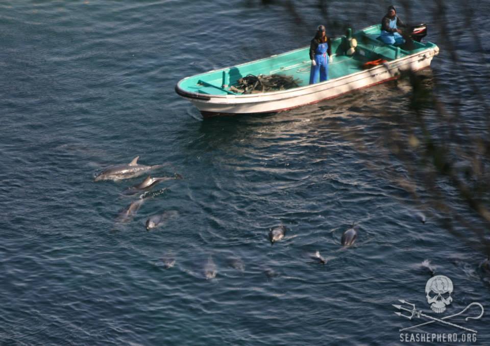Die taktische Überlegenheit der Hightech-Boote der Mörder trieben die verwirrte Delfinfamilie durch rasseln und schlagen mit Eisenstangen im Wasser in Richtung des Schandflecks von Japan.
