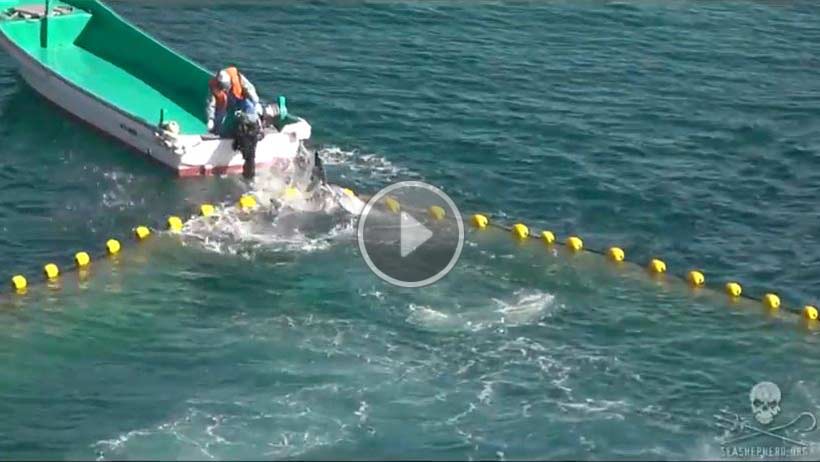 Auf diesem Video, heute morgen in Taiji-Japan gedreht, ist zu sehen wie die Mörder mit ihren Booten mit laufendem Motor Delfine überfahren!!