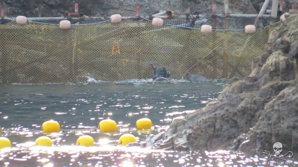 Die Boote kamen schnell in Fahrt und drängten die Delphine aggressiv in Richtung Taiji-Ufer. Der Hälfte der Familie gelang vorerst die Flucht, wurde aber wieder in die Netze zusammen getrieben. Die Delfine kämpfen verzweifelt um ihr Leben und um zu entkommen.