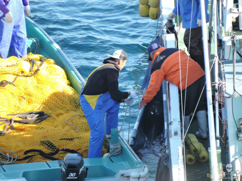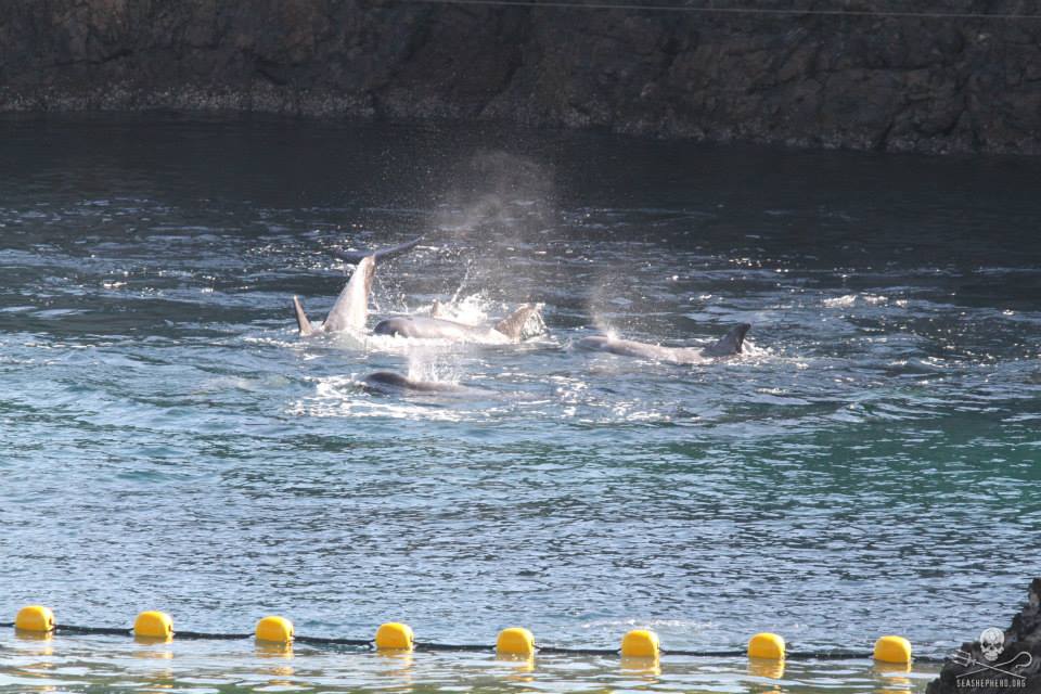 Als die Delphine gegen ihren Willen in die Hauptbucht gezwungen wurden klammerten sie sich verzweifelt mit Angst und Schrecken nahe aneinander. Zwei Rundkopfdelfine verfingen sich in Netzen während eines Versuchs um zu entkommen, doch die Mörder waren unerbittlich und zwangen sie zurück in die Tötung Bucht.