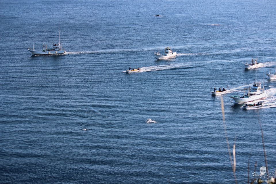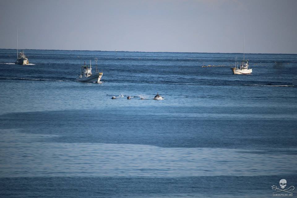 Kurz vor der Küste schärten ein paar Treibjagdboote weg von Hauptformation der Killerboote. Es schien dass sie eine zweite Delfinfamilie ins Visier nahmen. Die Mörder wollten die beiden Delfinfamilien zusammen zu führen. Doch es gelang ihnen nicht, die zweite Delfinfamilie konnte die Flucht ergreifen und entkam den Mördern.