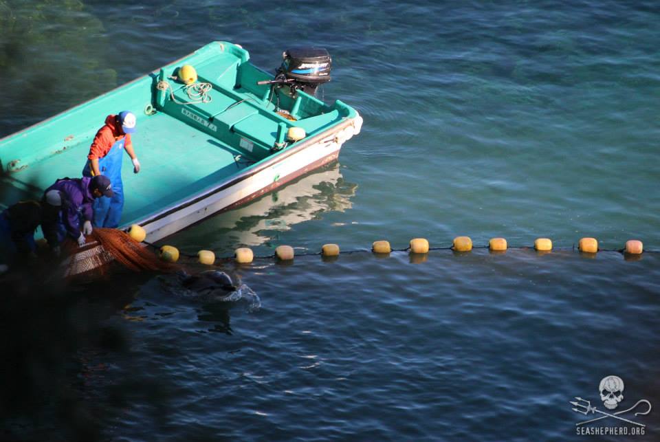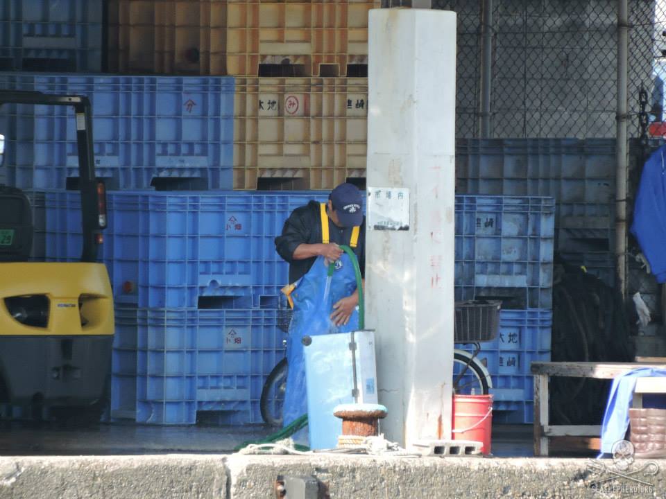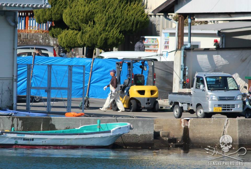 Ihre Leichen wurden in Haufen auf Schiffen gestapelt und zum Metzger Haus gebracht wo sie zu Fleisch verarbeitet wurden für Einheimische Bevölkerung. Wir gehen davon aus, dass heute Sonntag den 11. Januar 2015 ungefähr 30-40 Streifendelfine brutal abgeschlachtet wurden.