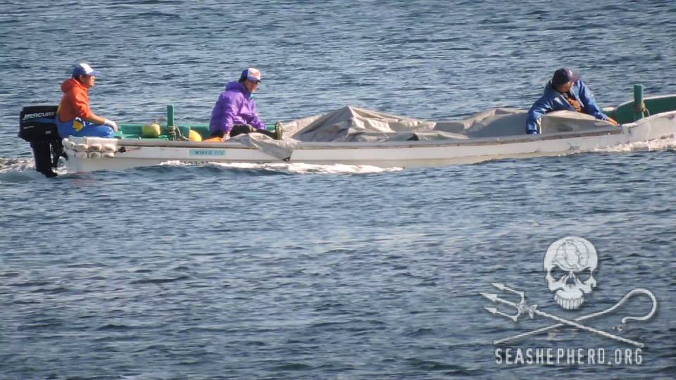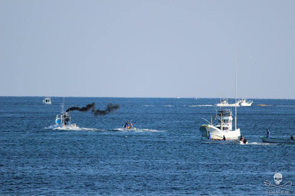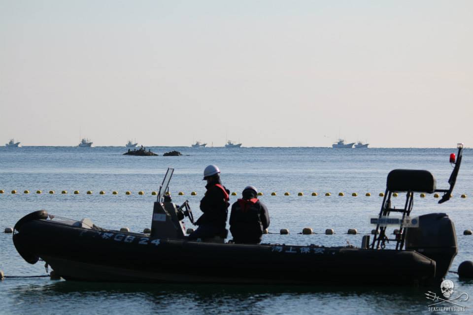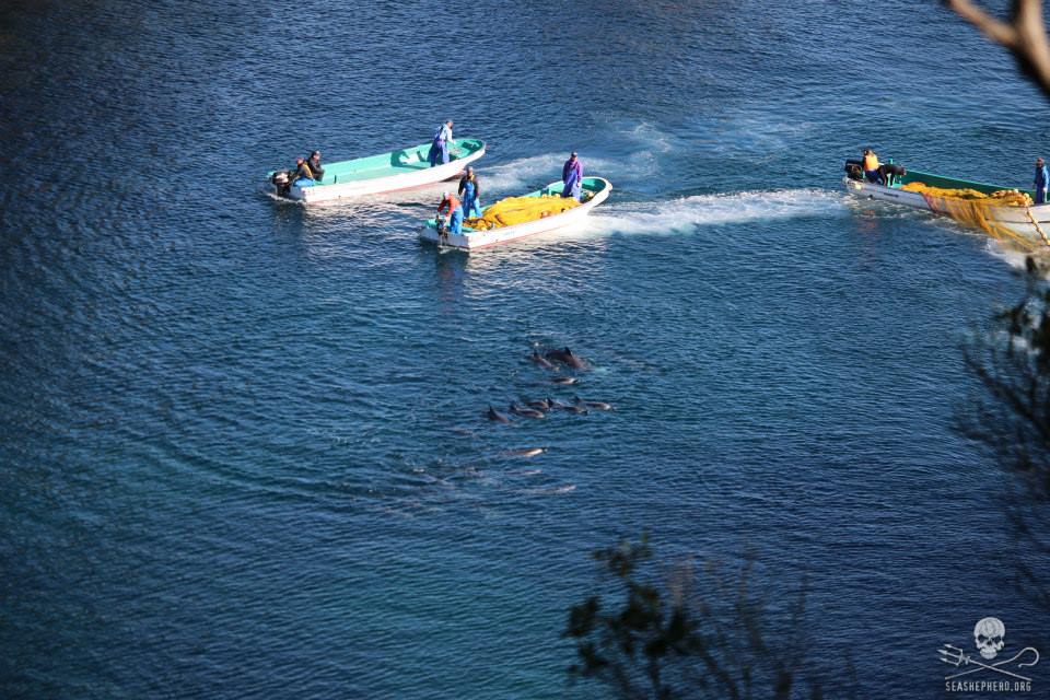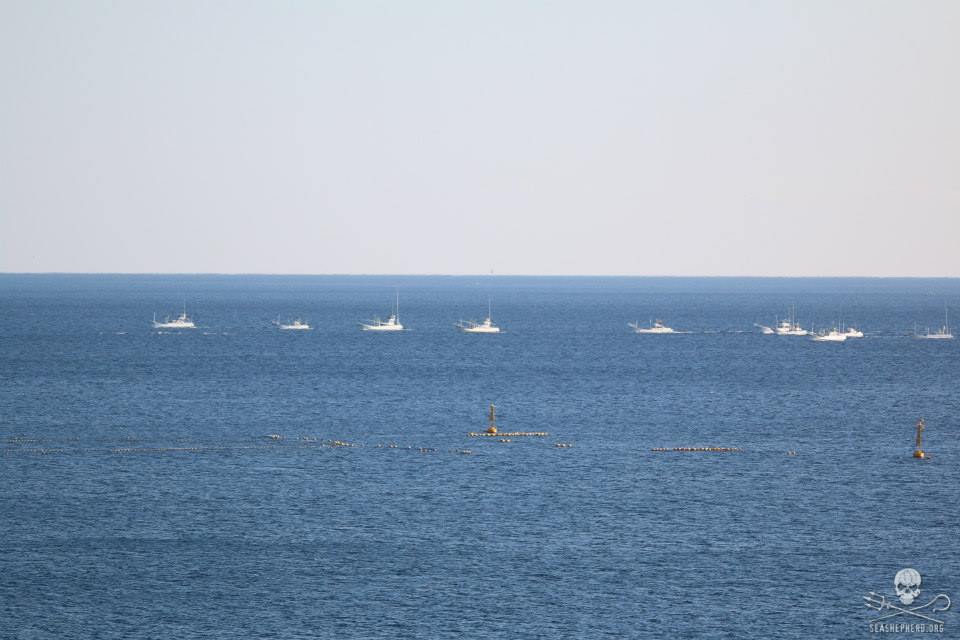 Alle 12 Mörder-Schiffe ging an diesem Sonntagmorgen auf die Jagt. Um ca. 08.10 Uhr sahen die Cove Guardians wie sich vier 4 der Mordboote am Horizont formierten. Kurz nachdem die restlichen Boote sich in das Laufwerk angeschlossen, drängten sie eine sehr große Schule Blau-Weiße Streifendelfine in Richtung des Hafens von Taiji.