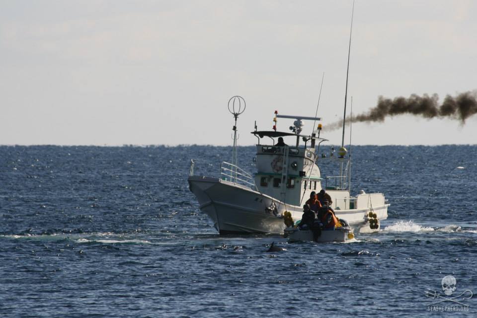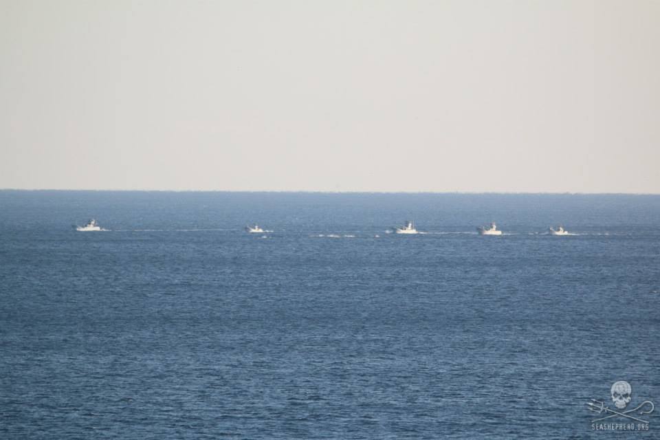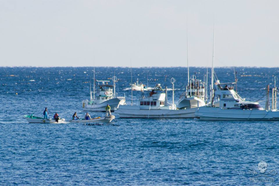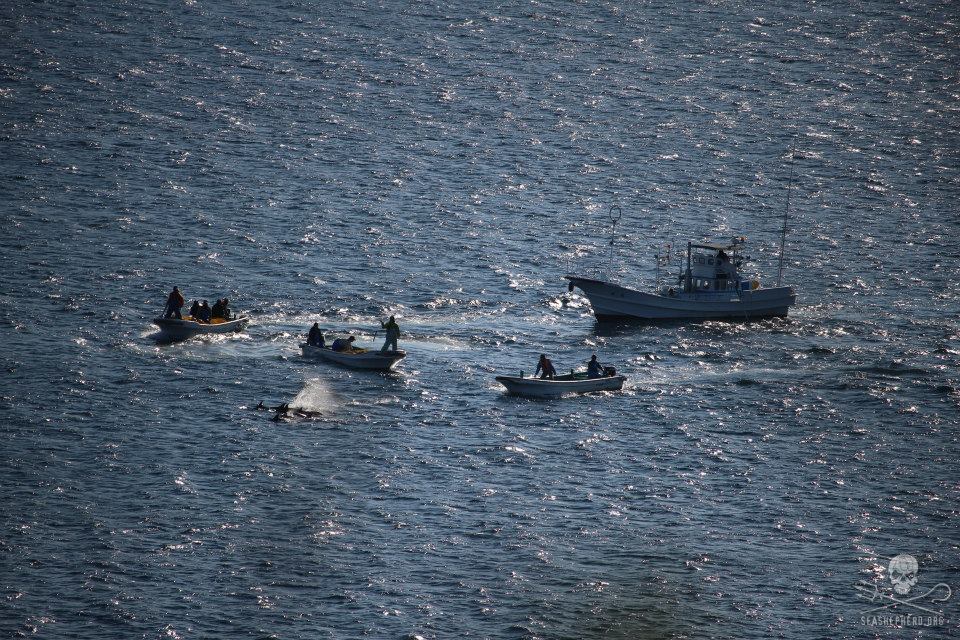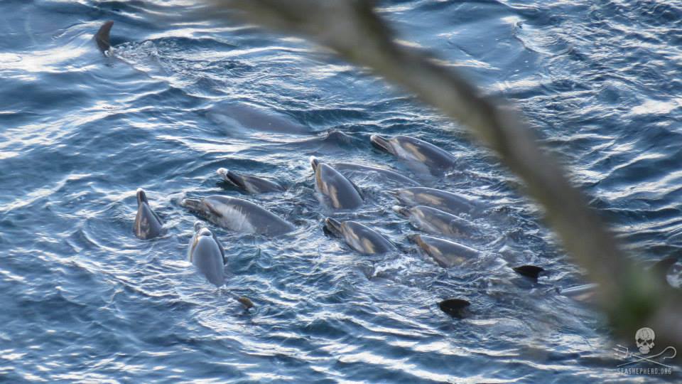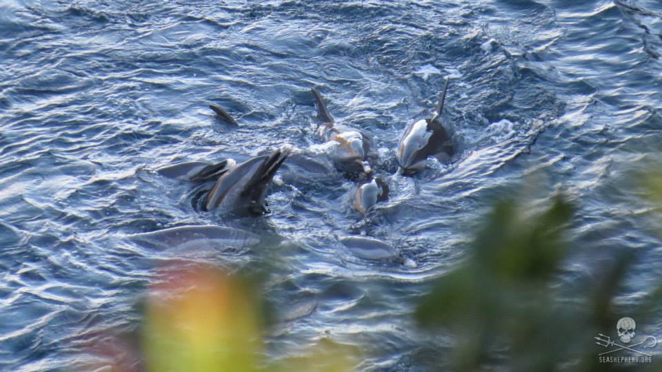 Heute Morgen um ca. 7:00 Uhr Lokalzeit Verliesen die Tötung-Schiffe den Hafen, sechs fuhren in südlicher Richtung, die anderen sechs in nördliche Richtung, wo sie das Wasser nach Beute durchkämmten. Ungefähr eine Stunde danach beobachteten die Cove Guardians wie sich sechs Schiffe am nördlichen Horizont formierte weil eine grosse Delfinfamilie aus südlicher Richtung heran nahte. Als die Delfine in der nahe genug bei den Mörder waren, wurden sie mit aller Gewalt in Richtung Küste getrieben.