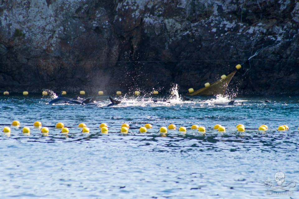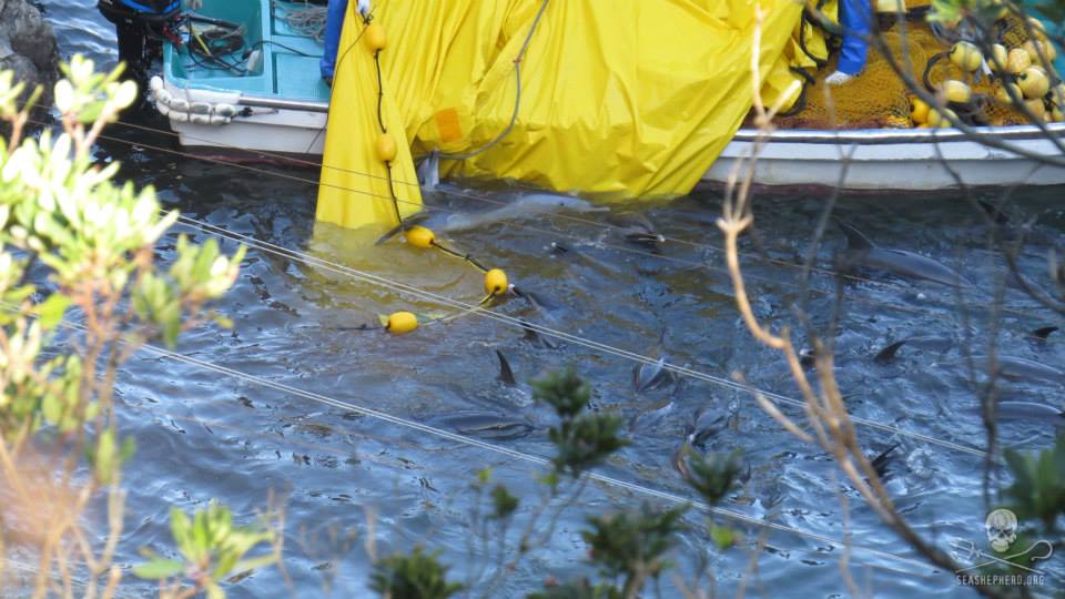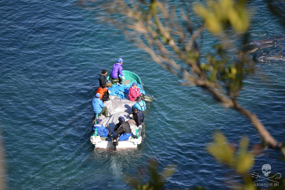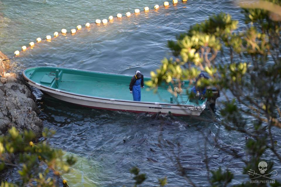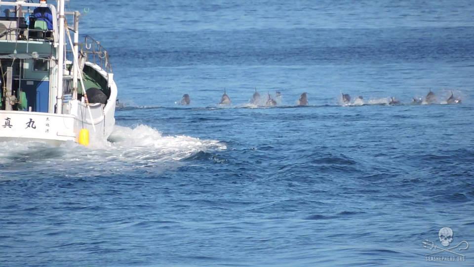 Die Barbaren benutzten ihre Schiffe um die restlichen 60 Delfine wieder auf das Meer zurück zu treiben, mit der gleichen unmenschlichen Methode wie zuvor als sie die Delfine in die Mörderbucht trieben. Auch während der Jagt selbst und beim Hinaustreiben überfuhren Boote der Mörder Delfine und verletzten viele von ihnen teils schwer.
