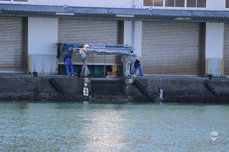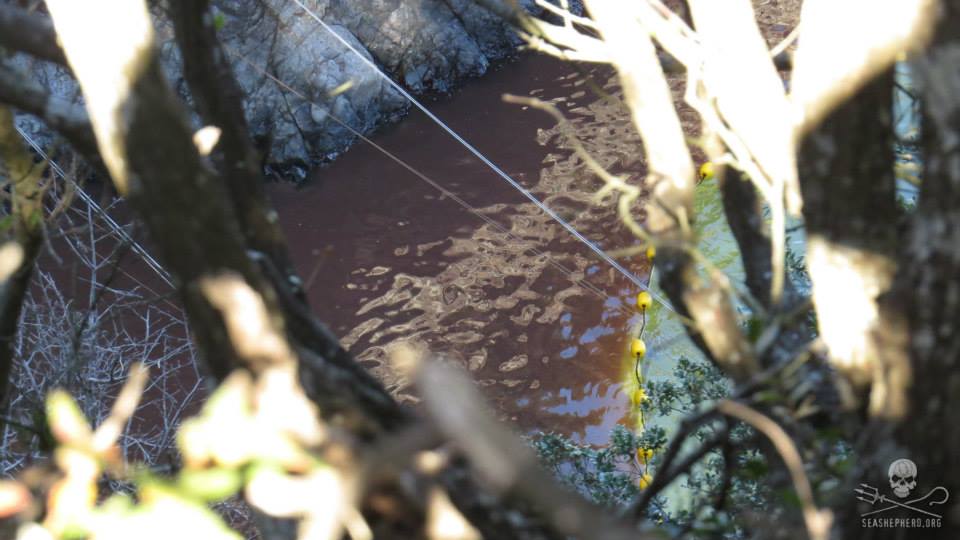 Wenige Augenblicke später transportierten Schiffe ca. 20 ermordete Delphine ins Schlachthaus. Das schreckliche Gemetzel fand gleichzeitig während der Auswahl für Gefangenschaft vor Ort unter verdeckten Planen statt.