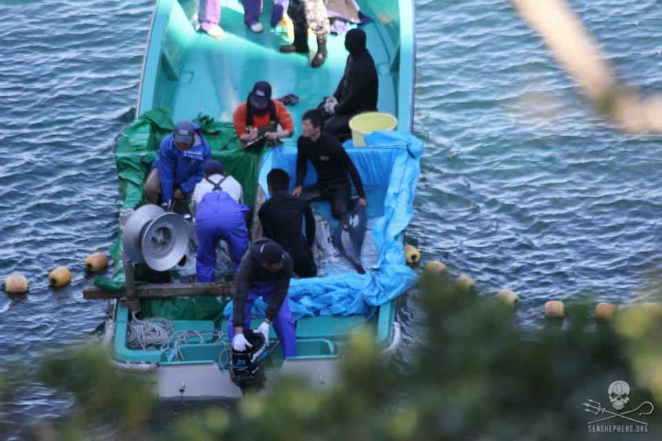 Trotz Erschöpfung kämpften die Delfine weiter für ihre Freiheit. Als die Delfinfamilie in die Bucht gedrängt wurde begangen die Mörder sofort mit der Auswahl der Delfine für Gefangenschaft und der Schlachtung. Die Mörder fuhren mit laufenden Schiffsmotoren über die Delfine und verletzten viel und einige sehr schwer.