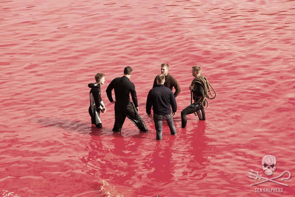 Sie wurden zu Boden geschlagen, bevor sie von der färöischen Polizei abgeführt wurden. Laut den letzten Berichten vom Strand, wurden Sea Shepherd Mitglieder mit lauten Obszönitäten beschimpft, während die Jäger diese wundervollen Tiere aufspießten und erstachen. Das Meer färbt sich rot mit ihrem Blut. Rosie Kunnecke und Christophe Bondue wurden in Handschellen vom Strand abgeführt.