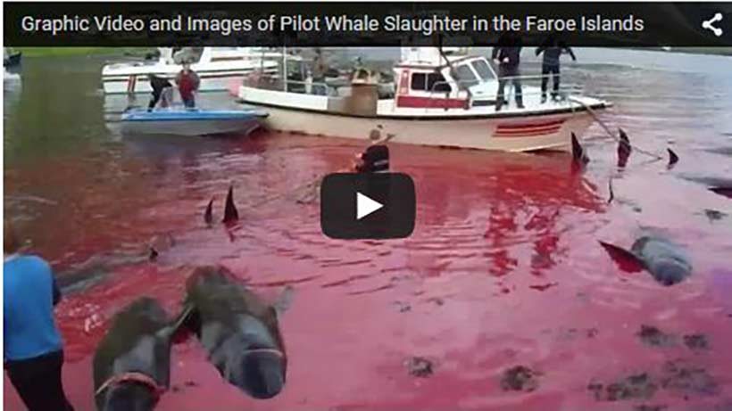 Das Videomaterial dieses Abschlachtens, auch bekannt unter dem färöischen Begriff „Grindadráp“ oder „Grind“, zeigt einen der Killer, wie er ein Messer aus seiner Tasche zieht und damit brutal auf mehrere Grindwale einsticht.