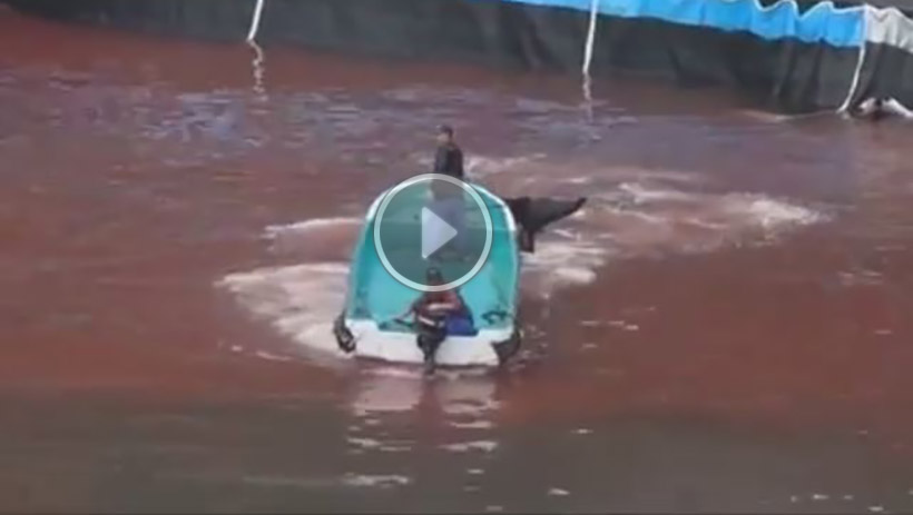 Auf diesem Video ist deutlich zu sehen, nachdem den Delfinen die Wirbelsäule mit einem spitzen Eisenstab zerstochen wurde, die Querschnittsgelähmten Delfine leiden weiterhin endlose Qualen. Nach mehr als 7 Minuten grauenvollen und unglaublich schmerzhaften Leidens, ertrinkt ein Delfin im Wasser seines eigenen Blutes, andere Streifendelfine litten weiter querschnittgelähmt bis 20 Minuten oder mehr.