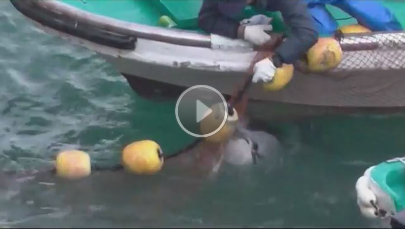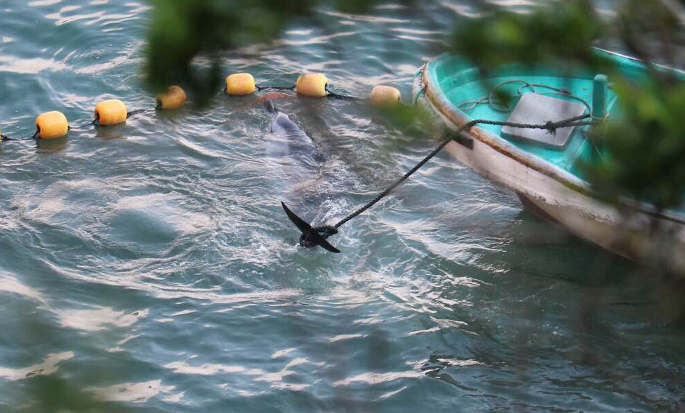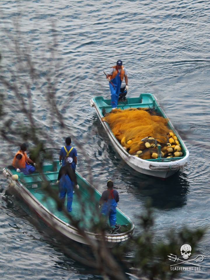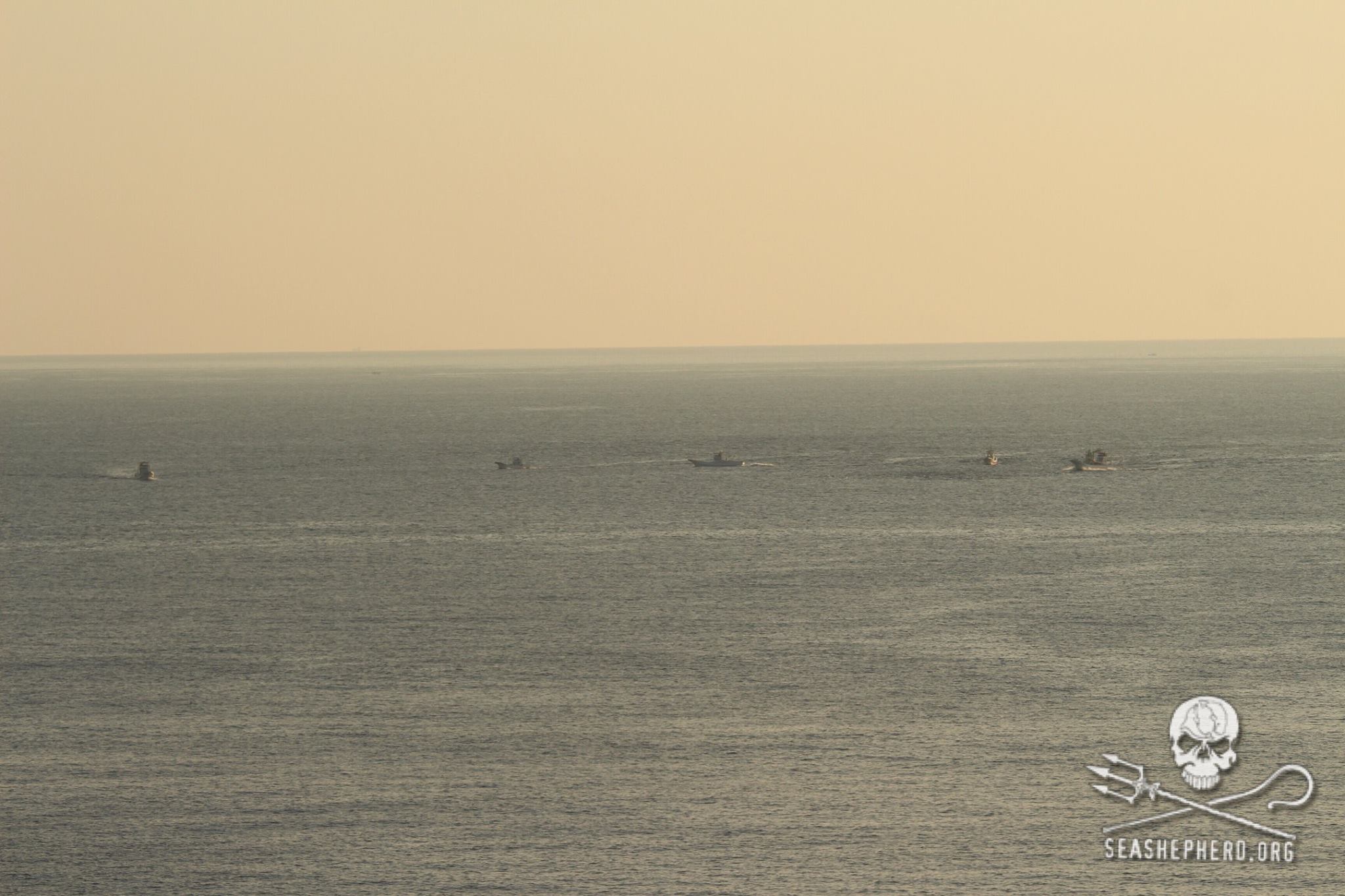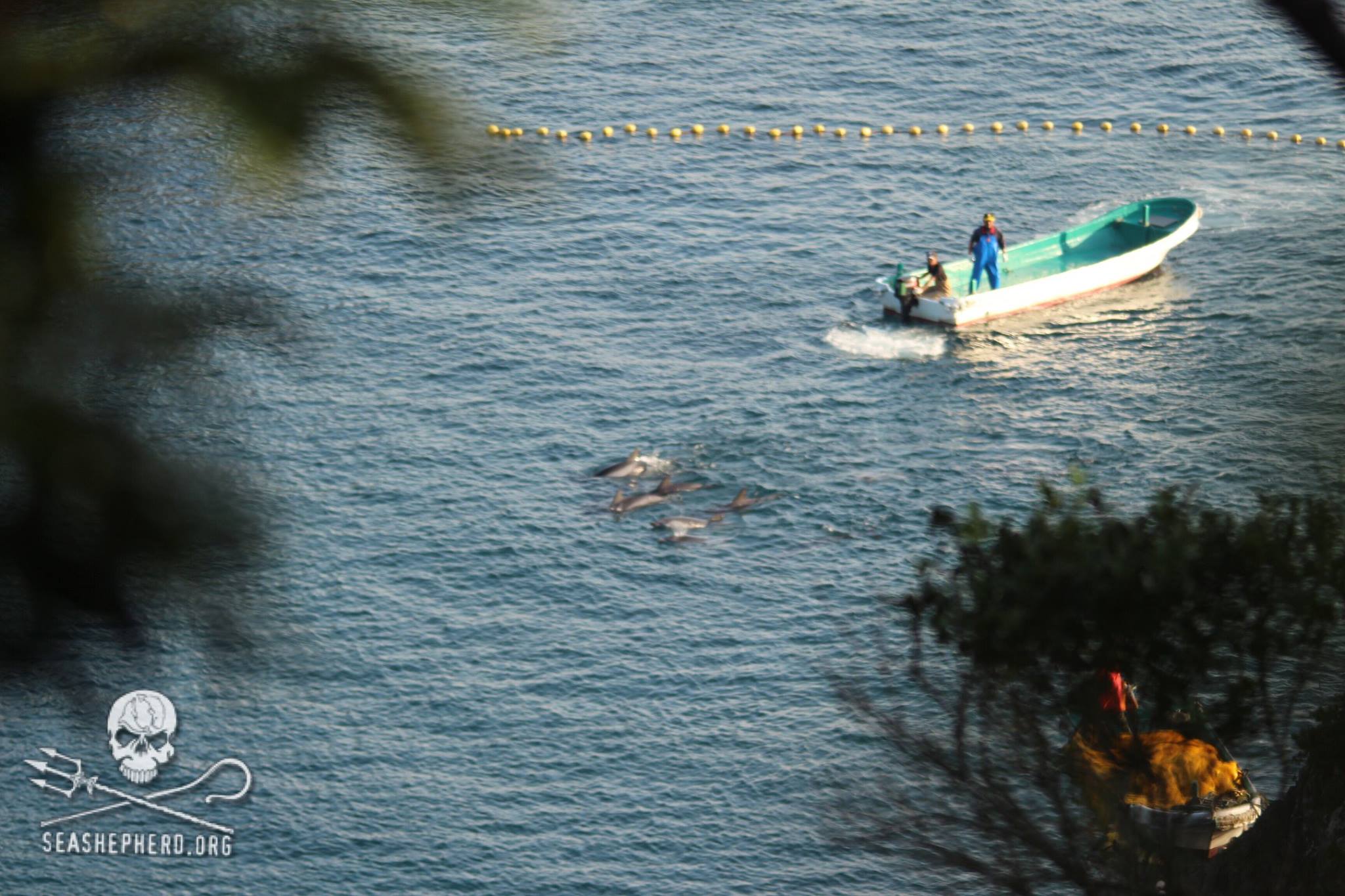 Mit sechs Schiffen trieben die Mörder die Delfine in Richtung Bucht , während vier andere Schiffe in den Hafen zurück fuhren, für die Vorbereitung um den 100+ unschuldigen Delfinen das Leben zu stehlen.