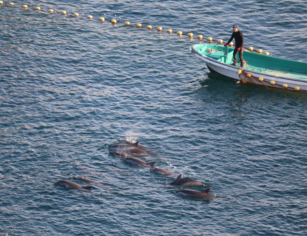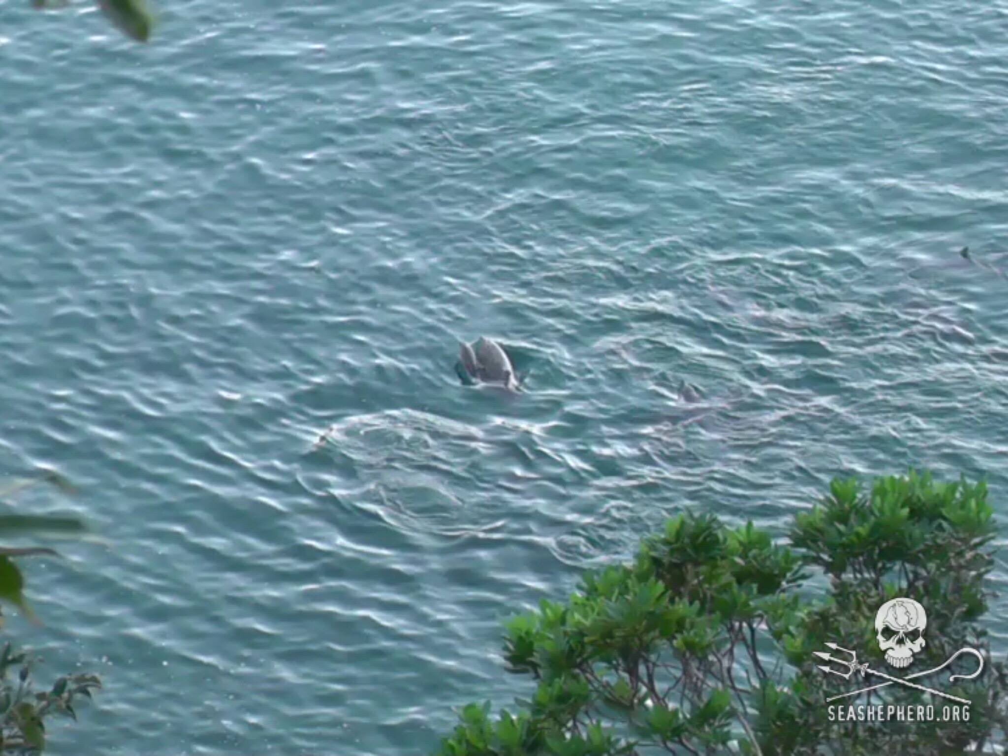 Unmittelbar nachdem die Mörder aufs Meer fuhren um Delfine für zum Abschlachten zu suchen, entdeckten sie in den Gewässern kurz vor der Küste von Taiji eine grosse Streifen Delfin Familie, geschätzt mit über 100 Delfinen.