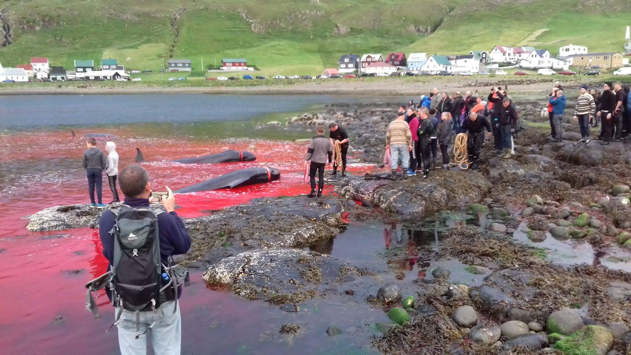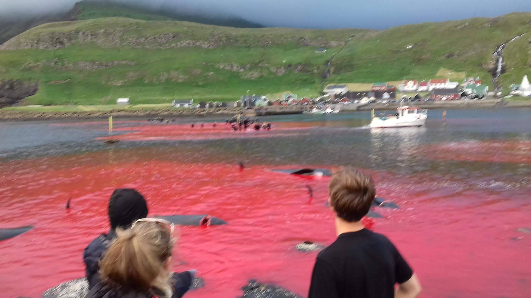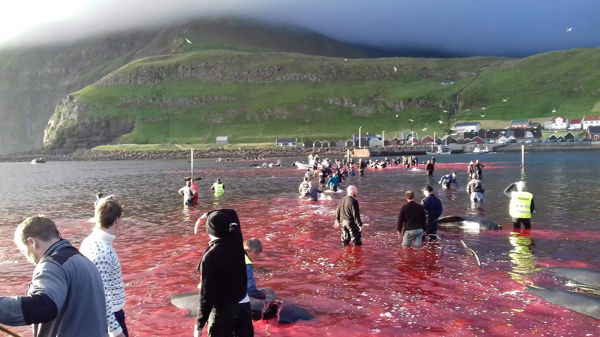 Das Blut von 100 wehrlosen sanften Wesen färbte das Meer am Strand der Färöer Inseln tiefrot durch den unersättlichen Blutdurst der barbarischen Monster. Viele Färöer sind wahrlich besessen mit ihren kleinen schnellen Motorboten Wale und Delfine auf dem offenen Meer zu hetzen und zu foltern, am Strand verwandeln sie sich in blutrünstige Monster, denn töten ist ihre Tradition. „Ein Mann der noch kein Wal oder Delfin getötet hat, ist kein Mann“ , soder Slogan und Rechtfertigung ihrer früh-mittelaterlichen Tradition.