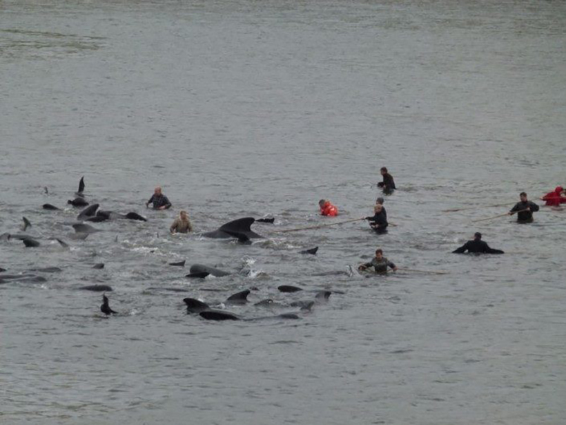18 Speed Boote hetzten die Pilotwale stundenlang bis sie geschwächt strandeten. Höchstwahrscheinlich ertranken einige erschöpften Baby-Pilotwale, wie jedes Mal während der grausamen Treibjagd. Pilotwale (Gatung der Delfine), sowie alle anderen Delfinarten sind so sehr soziale Wesen, dass alle Mitglieder des Familienverbandes einander in den Tod folgen.