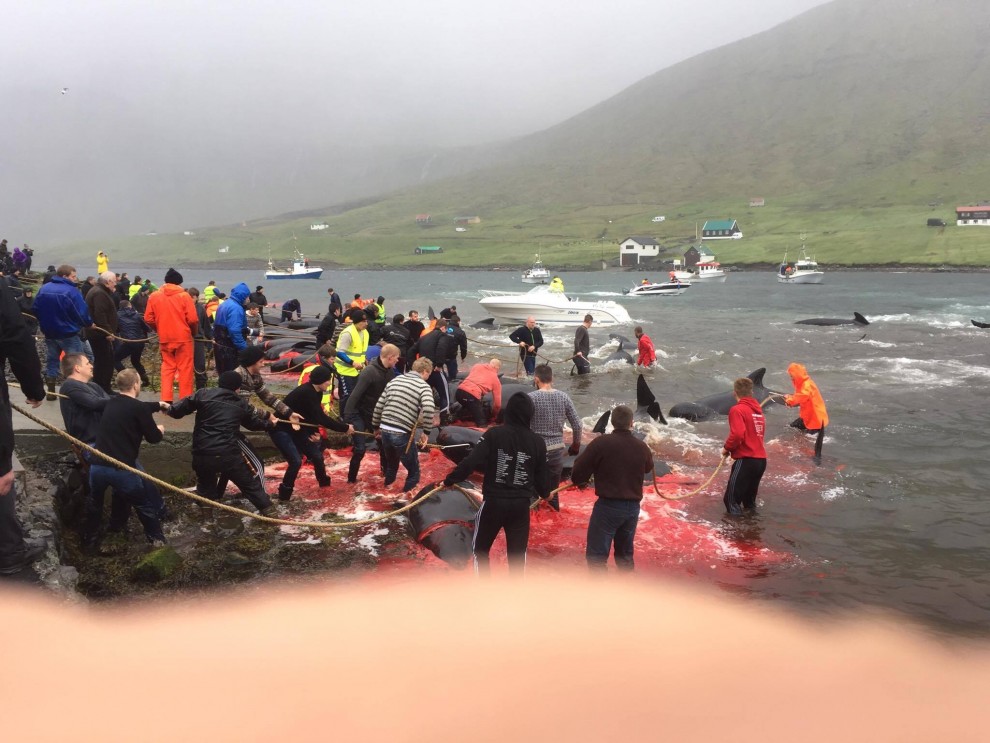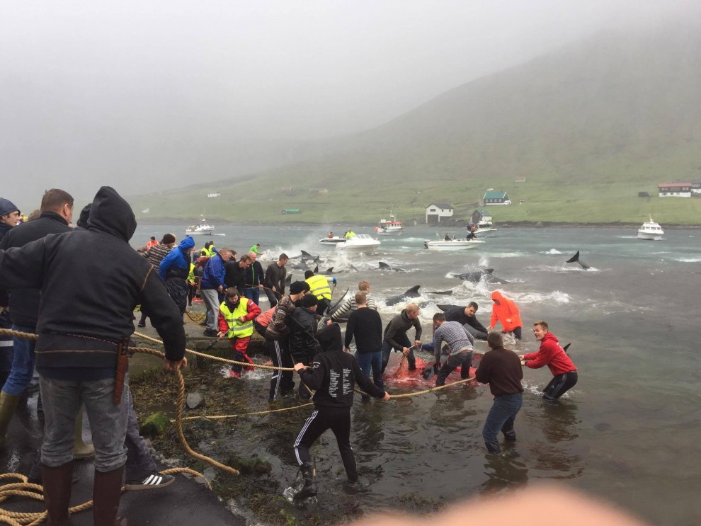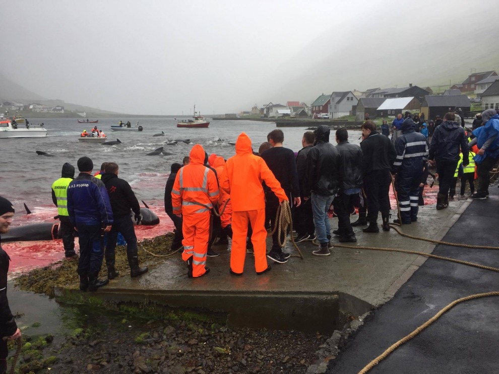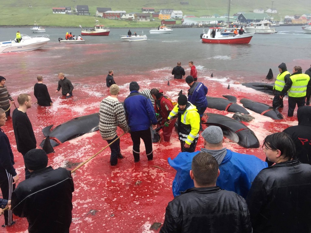 Trotz schlechten Wetter fuhren 20 Schnellboote aus dem Hafen, darunter auch kleinere einsitzige "Speedmaschienen", wie die "Gestörten" rasten sie mit Vollgas zu der Pilotwal Familie hinaus um sie an den Strand von Hvannasund zu jagen wo sie brutal abgeschlachtet wurden. Zweienhalb Stunden später strandeten mehr als 70 Pilotwale, sofort stürzte sich die nervös wartende Meute von über 50 Färöer mit langen Messern und Hacken an Seilen bewaffnet über die verängstigte, verwirrte Pilotwal Familie. Alle Familienmitglieder wurden von den blutrünstigen Barbaren im Blutrausch niedergemetzelt, Babys, Kinder, Erwachsene und die Matriarchin.