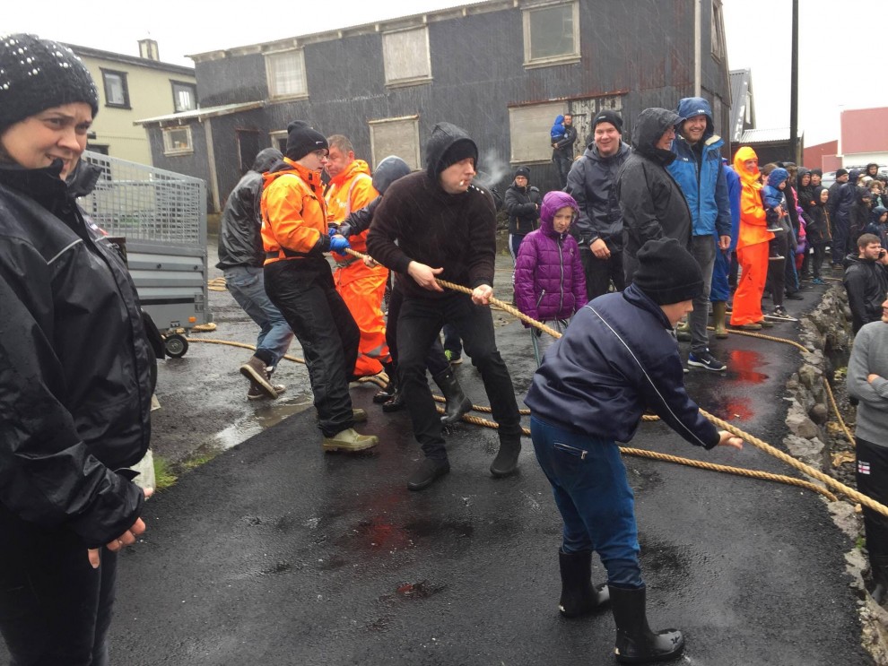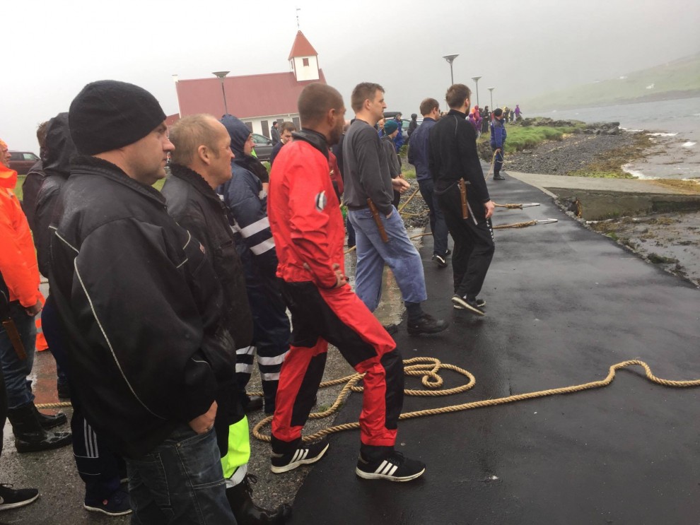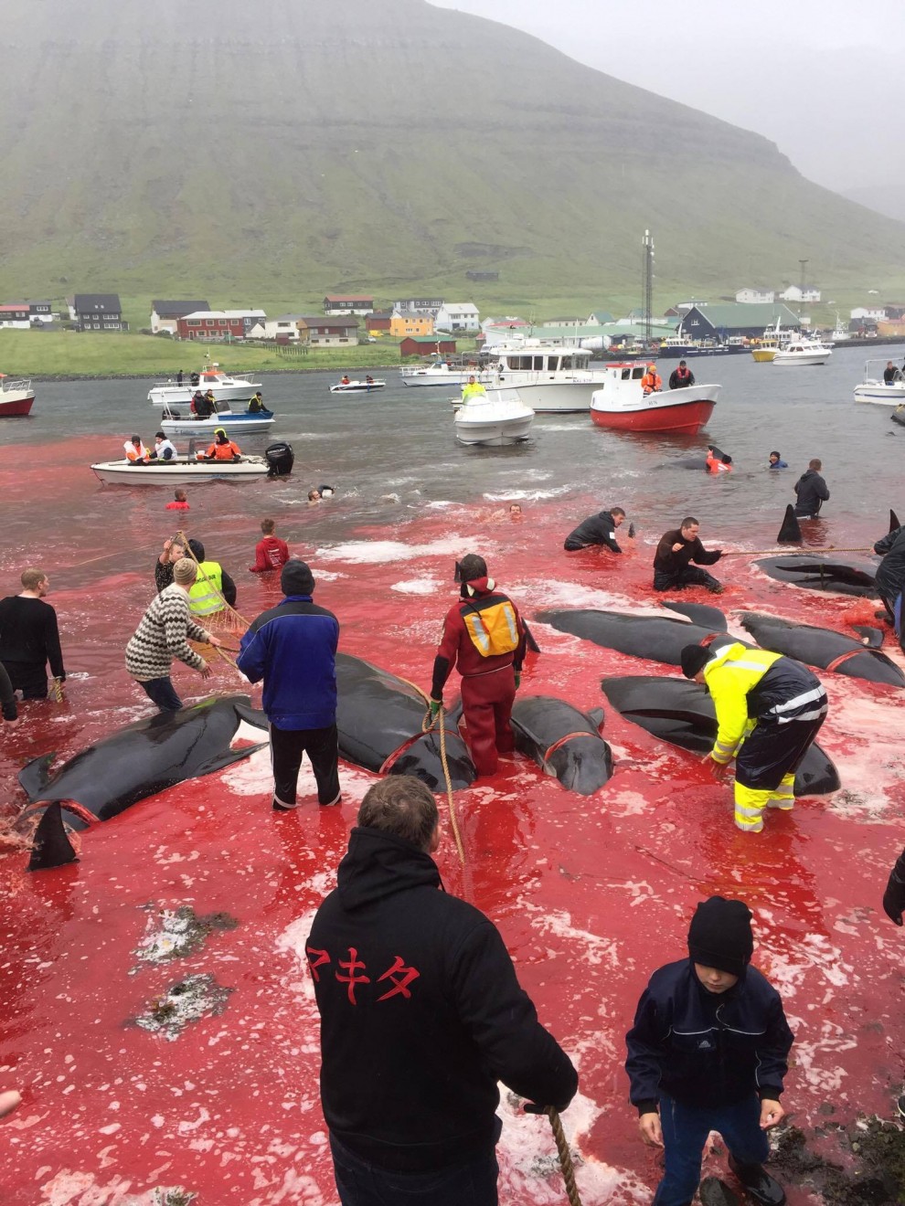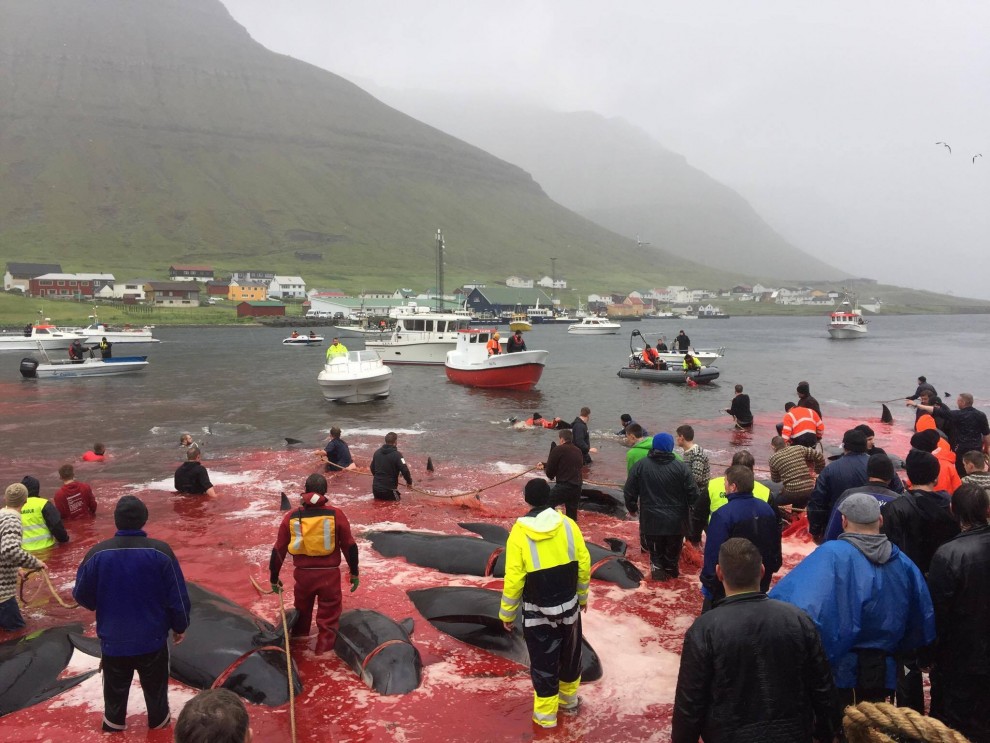 Trotz schlechten Wetter fuhren 20 Schnellboote aus dem Hafen, darunter auch kleinere einsitzige "Speedmaschienen", wie die "Gestörten" rasten sie mit Vollgas zu der Pilotwal Familie hinaus um sie an den Strand von Hvannasund zu jagen wo sie brutal abgeschlachtet wurden. Zweienhalb Stunden später strandeten mehr als 70 Pilotwale, sofort stürzte sich die nervös wartende Meute von über 50 Färöer mit langen Messern und Hacken an Seilen bewaffnet über die verängstigte, verwirrte Pilotwal Familie. Alle Familienmitglieder wurden von den blutrünstigen Barbaren im Blutrausch niedergemetzelt, Babys, Kinder, Erwachsene und die Matriarchin.