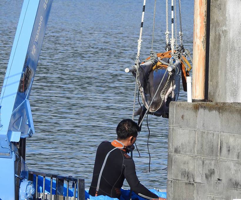 Diese intelligenten und empfindungsfähigen „Personen des Ozeans“ wurden in Schlingen gelegt, aus den dem Käfig herausgezerrt, an die Seite des Bootes gefesselt über die Bucht gezogen, mit einem Kran aus dem Wasser gehievt und in eine Holzkiste geworfen. Danach wurden sie mit einem Stapler auf einen Transporter gehoben und zum Taiji Whale Museum abtransportiert.