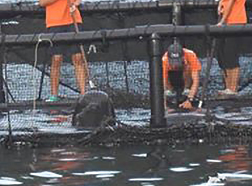 Die am 3/4/5 September entführten jungen Pilotwale werden nun im Käfig gezwungen den ersten Teil des "Trainingsprozesses" für die Delfinarienhaltung zu ertragen. Sie werden gezwungen toten Tintenfisch aus der Hand zu fressen.