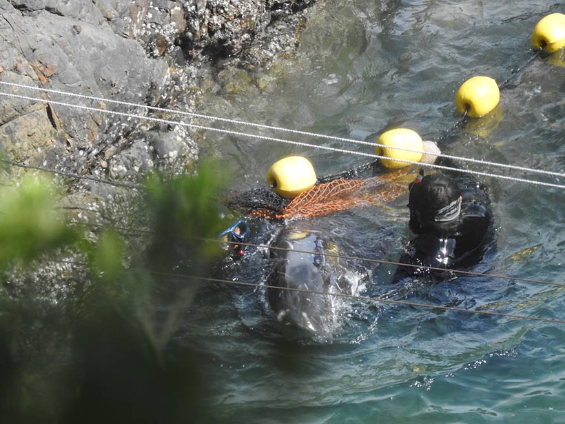 Während der Verzögerung kam ein Boot mit „Trainer“ in die Mörderbucht, die typische blau- orange farbige Kleider des Taiji Whale Museums trugen, sie gingen zusammen mit den Delfin Jägern unter die Planen um die Opfer dieser Treibjagd zu inspizieren. Ein paar Delfine waren aus dem Tötungsstrand entkommen, anstatt weiter in Richtung Freiheit und Sicherheit zu schwimmen, wandten sie sich wieder ihrer Familie zu und schwammen zurück zu ihnen unter die Planen in den Tod. Die soziale Hingabe und familiären Zusammenhalt von Rissos Delfinen ist nicht nur bewundernswert, in diesem Fall herzzerreissend; und ein Grund mehr endlich Cetacean Rights, die Rechte von Delfinen und Walen in internationalen Gesetzbüchern niederzuschreiben. Wale und Delfine sind wissenschaftlich als Personen des Ozeans bestätigt.