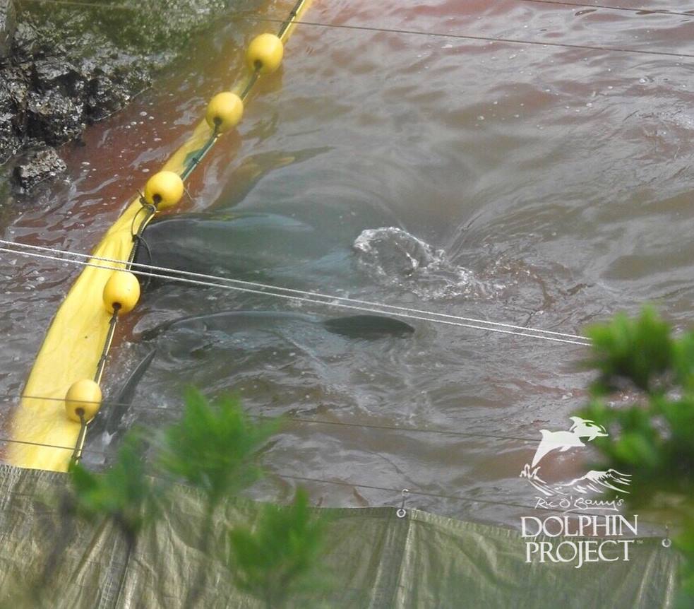 Als die Pilotwale in die Mitte des Aussennetzes getrieben waren, verliessen alle Boote die Bucht für Mittagspause. Die Pilotwal Famile fing an langsam wieder in die Bucht zuzurück zu schwimmen, alle eng aneinander geschmiegt, streckten ihre Köpfe (Spyhopping) aus dem Wasser und suchten in der Nähe der Planen nach ihren vermissten Familienmitgliedern. Die soziale Familienverbundenheit von Pilotwalen ist so gross, dass sie nichts aufhalten lies in das Blut ihrer Angehörigen zurück zu kehren. Die Szene vor der Bucht war so herzzerreissend, dass dies mit Text kaum beschreibbar ist. Bitte schauen Sie sich das Livestream Video an. Die Videoqualität ist nicht sonderlich gut weil es per internet gesreamt wurde, doch ist es erneut Beweis für die Gräueltaten an Delfinen in Taiji-Japan.