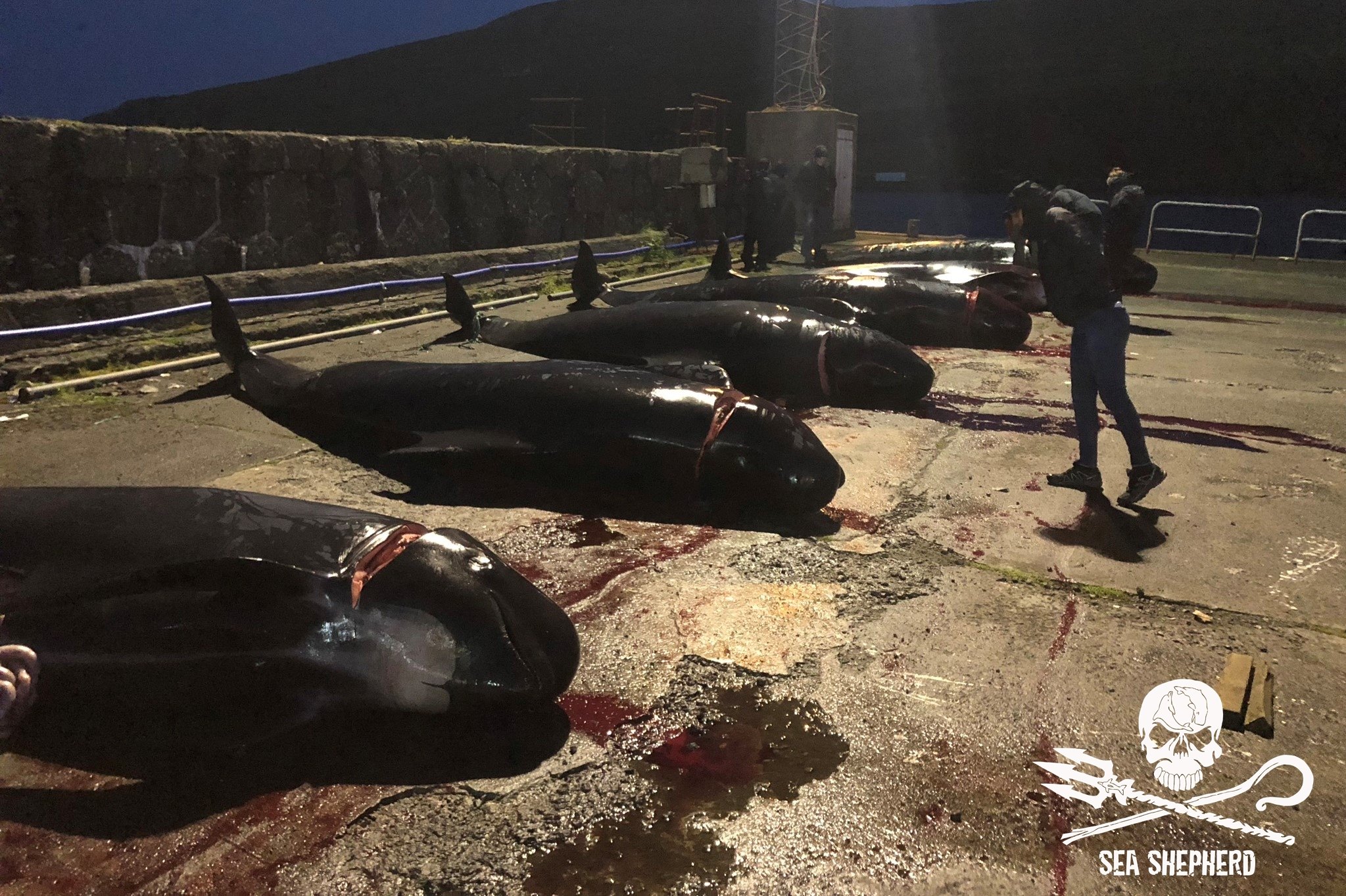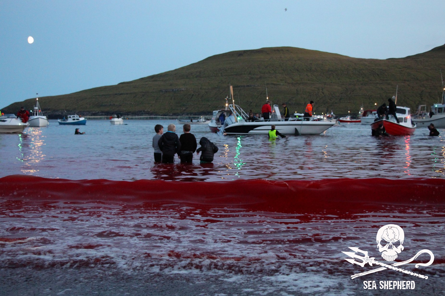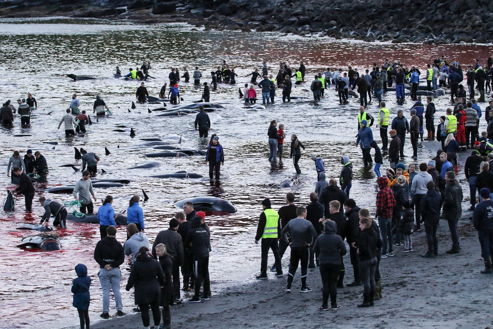 Kinder, Frauen und Erwachsene nahmen am Blood-Sport teil, es ist ihre alten Wikinger-Tradition zu morden; nicht für Fleisch für den Wintervorrat, wie fälschlicherweise in den Medien erzählt wird, das durch eine färöische Propaganda ausgelöst wurde. Delfinfleisch ist giftig und ungeniessbar, in den Färöer Inseln dreht sich’s nur ums gesellschaftliche Foltern und Töten wehrloser Opfer.